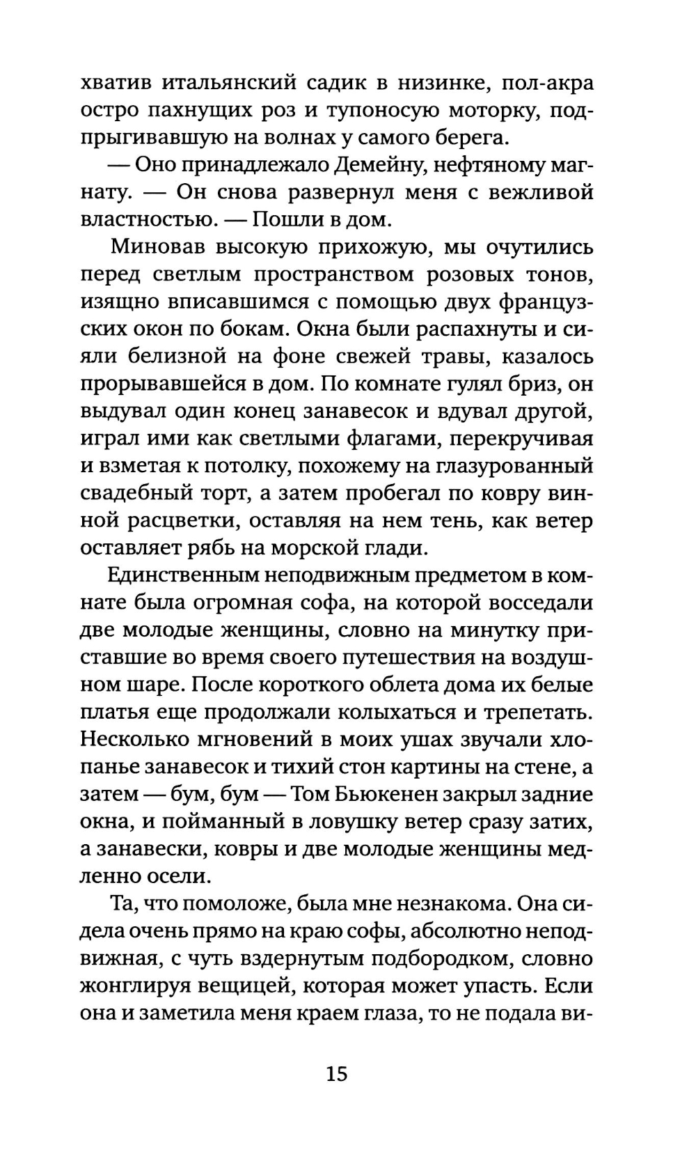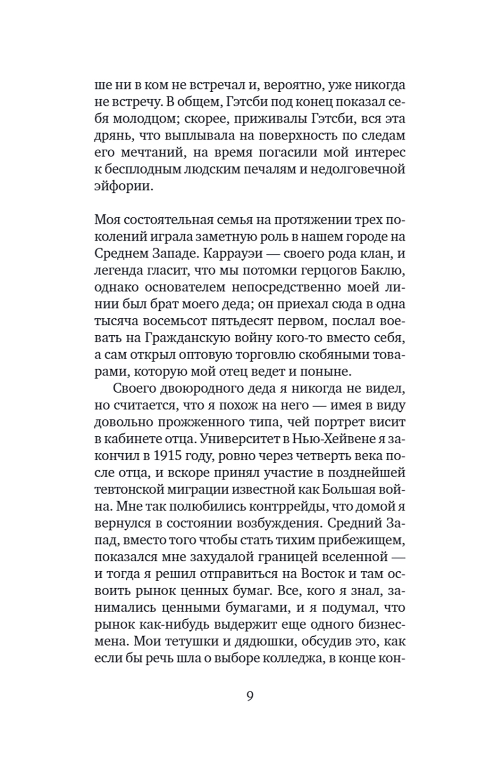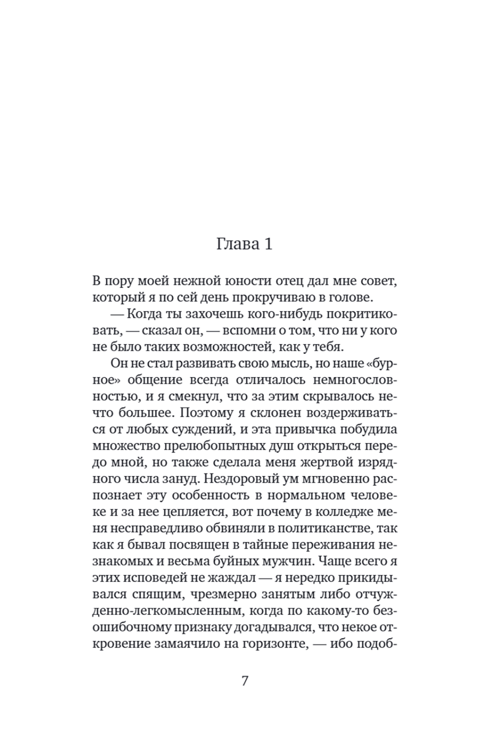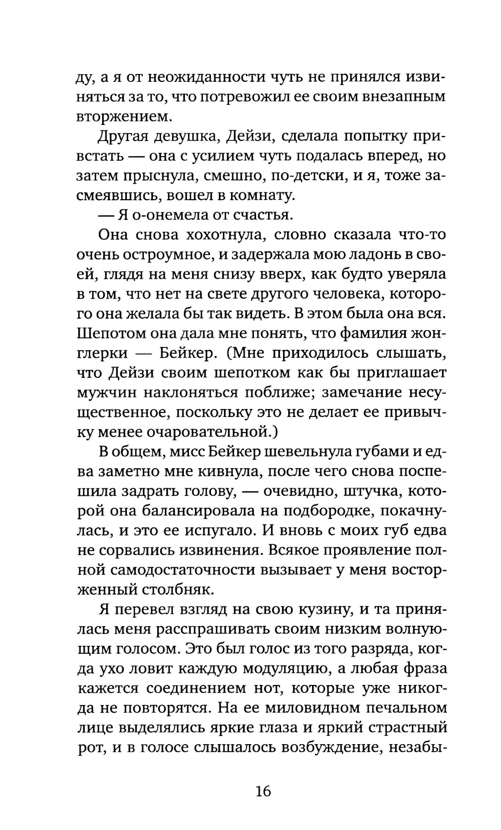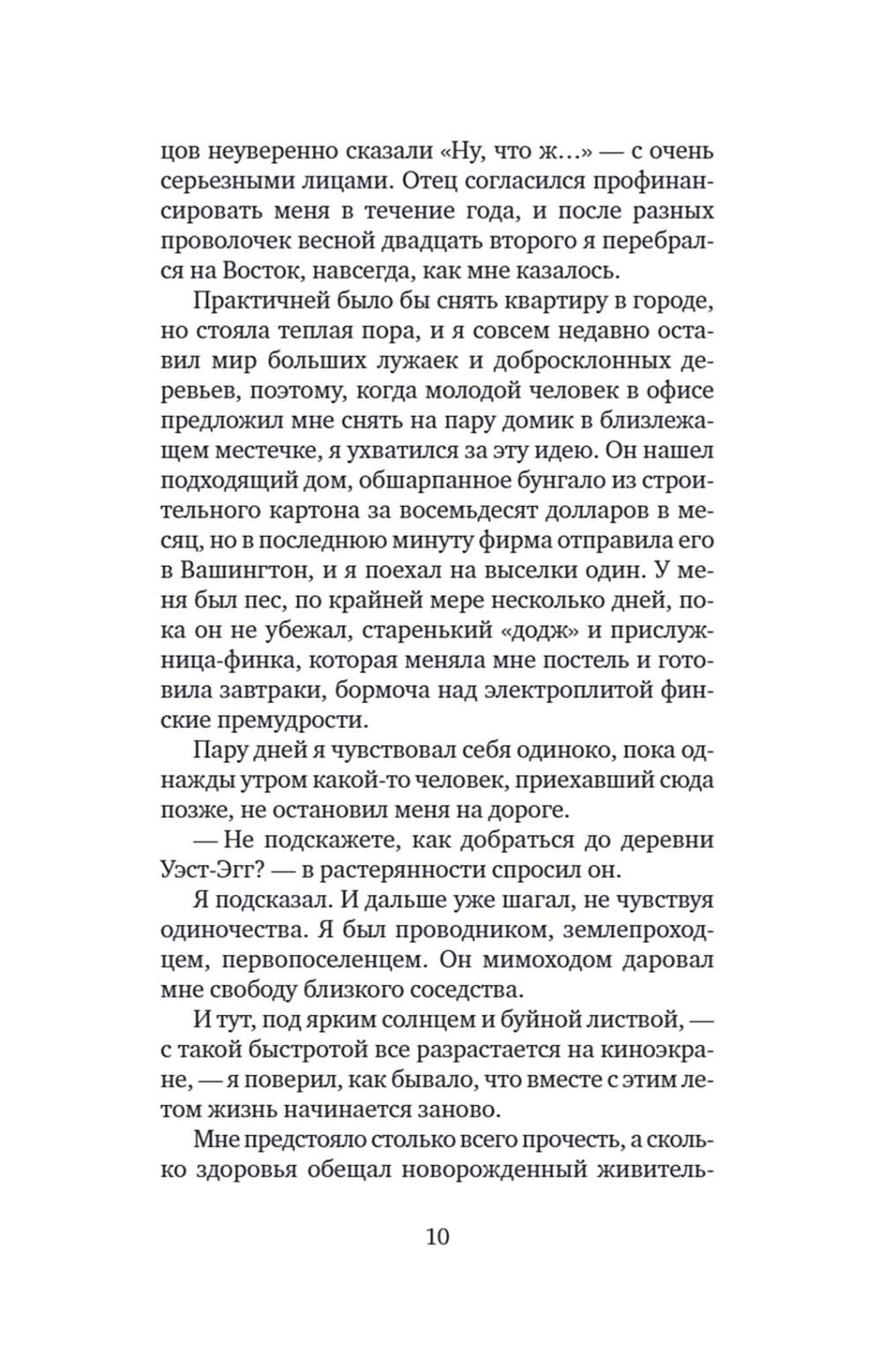 Роман Фрэнсиса Скотта Фицджеральда (1896-1940) «Великий Гэтсби»- один из шедевров американской литературы. Герой романа - воплощение двух противоположностей: наивный мечтатель, щедрый романтик, с одной стороны, с другой - делец, стремящийся к богатству и успеху. Вся его жизнь подчинена стремлению завоевать любовь молодой женщины Дейзи, ради этого он покупает виллу неподалеку от ее дома, устраивает бесконечные праздники, на которые приезжают толпы гостей. Но все напрасно: богатство и счастье отнюдь не одно и то же - после его смерти никто из людей, без зазрения совести пользующихся гостеприимством Гэтсби, и даже любимая женщина не пришли на его похороны. Таков трагический финал этого незаурядного мечтателя. Мой роман - о том, как растрачиваются иллюзии, которые придают миру такую красочность, что, испытав эту магию, человек становится безразличен к понятию об истинном и ложном.| Издательство | Текст |