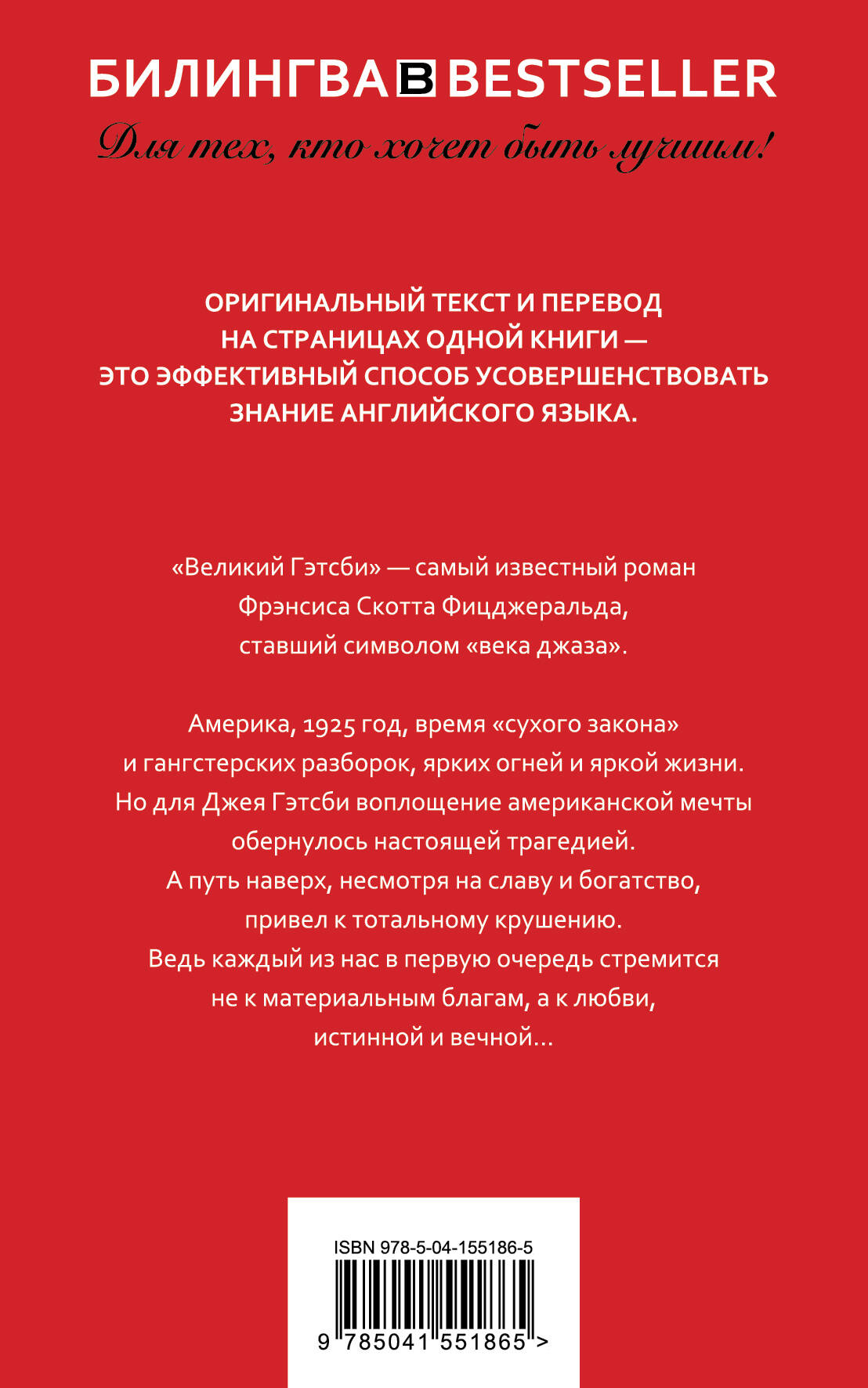 Для тех, кто хочет быть лучшим! Оригинальный текст и перевод на страницах одной книги - это эффективный способ усовершенствовать знание английского языка. Фрэнсис Скотт Фицджеральд - американский классик мировой литературы. Писатель, ярко и беспристрастно отразивший безумную жизнь 20-х годов. Он и сам был плотью от плоти той легендарной эпохи. Но эксцентричность и внешняя позолота канули в прошлое, и в настоящем остались его бессмертные книги. «Великий Гэтсби» - самый известный роман Фрэнсиса Фицджеральда, ставший символом «века джаза». Америка, 1925 г., время «сухого закона» и гангстерских разборок, ярких огней и яркой жизни. Но для Джея Гэтсби воплощение американской мечты обернулось настоящей трагедией. А путь наверх, несмотря на славу и богатство, привел к тотальному крушению. Ведь каждый из нас в первую очередь стремится не к материальным благам, а к любви, истинной и вечной…| Издательство | ООО "Издательство "Эксмо" |