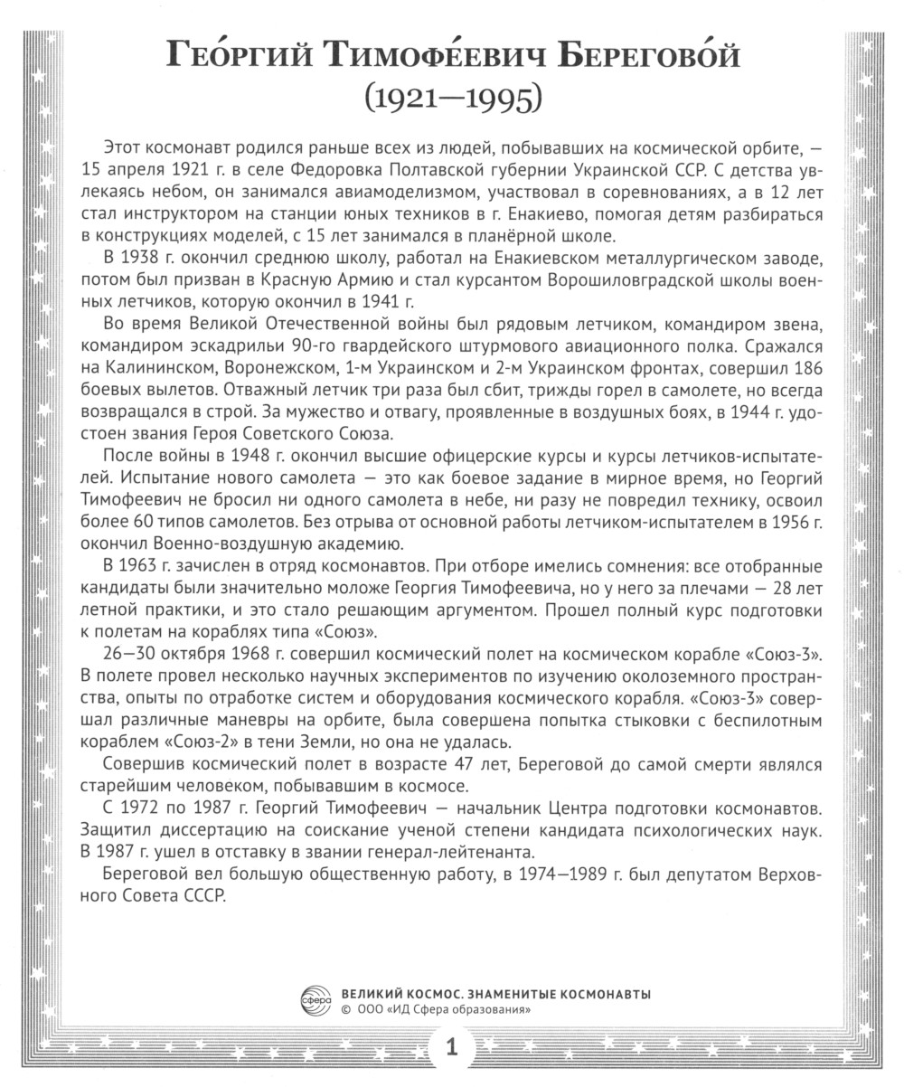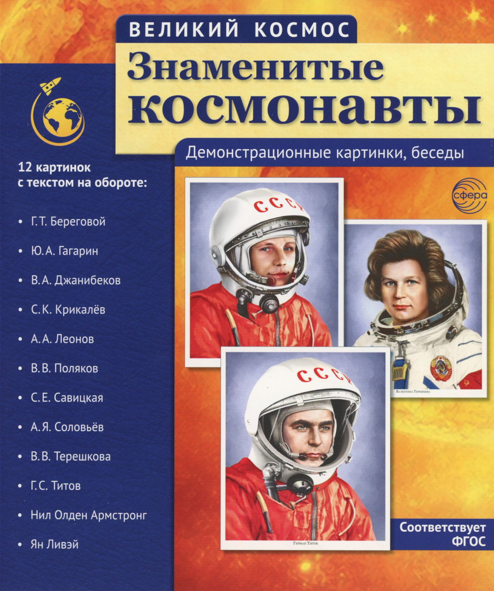 В демонстрационные материалы «Знаменитые космонавты» вошли портреты и биографии известных космонавтов: - первого космонавта Земли Ю.А. Гагарина; - космонавта-ветерана ВОВ Г.Т. Берегового; - впервые осуществившего стыковку пилотируемого космического корабля с вышедшей из-под контроля орбитальной станцией В.А. Джанибекова; - первого российского космонавта на американском «Шаттле», бортинженера первого экипажа МКС С.К. Крикалёва; - совершившего первый выход в открытый космос А.А. Леонова; - рекордсмена по продолжительности работы в космосе за один полет В.В. Полякова; - первой женщины, побывавшей в открытом космосе С.Е. Савицкой; - рекордсмена по общей длительности выходов в открытый космос А.Я. Соловьёва; - первой в мире женщины-космонавта В.В. Терешковой; - второго космонавта Земли Г.С. Титова; - первого человека на Луне Нила Армстронга; - первого китайского космонавта Яна Ливэя. Рекомендуем использовать их для постоянной или временной экспозиции в группе или классе.| Издательство | Творческий центр Сфера |