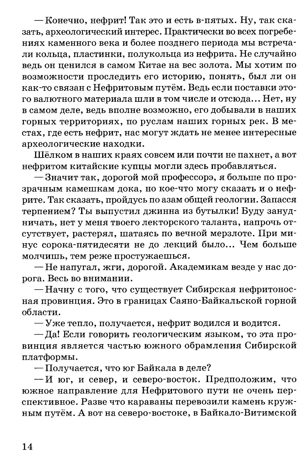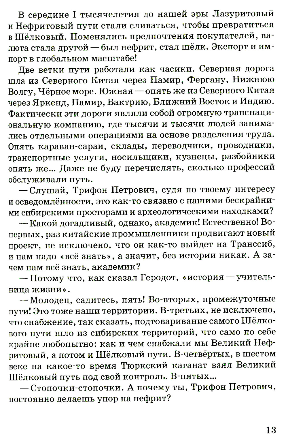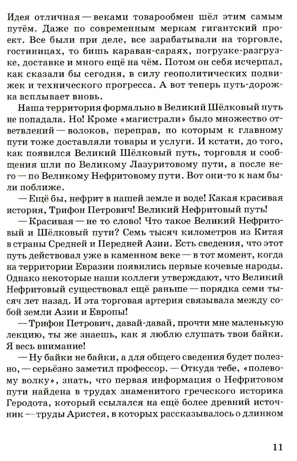 В мире много великих путей, которые связывали страны и народы: Великий Лазуритовый, Шёлковый, Меховой, Чайный, «из варяг в греки»… Но был ещё один, названный по имени камня, который, без всякого преувеличения, сыграл выдающуюся роль в истории человечества - так бесценны оказались его уникальные свойства. Камень обожествляли, наделяли волшебными чертами, считали, что он приносит удачу, счастье, любовь, здоровье, успокоение и многое-многое другое. Камень нефрит дал имя пути - Великий Нефритовый путь. Он объединил множество дорог, по которым зелёный, белый, серый, чёрный, красный, жёлтый и синий нефрит доставлялся жаждущим. Магистральная дорога притягивала к себе множество земель, в которых нефрит добывался, обрабатывался, превращался в произведения великого искусства. Археологические находки доказывали - нефритовые артефакты нередко изготавливались из местного сырья местными мастерами. В этой повести герои, знакомые по удивительным приключениям на Ольхоне («Котёл Чингисхана»), нашедшие сибирский булат и разгадывающие тайны загадочного племени курыкан («Волшебный меч курыкан»), отправляются в новое путешествие, окутанное нефритовыми историями.| Издательство | РуДа |