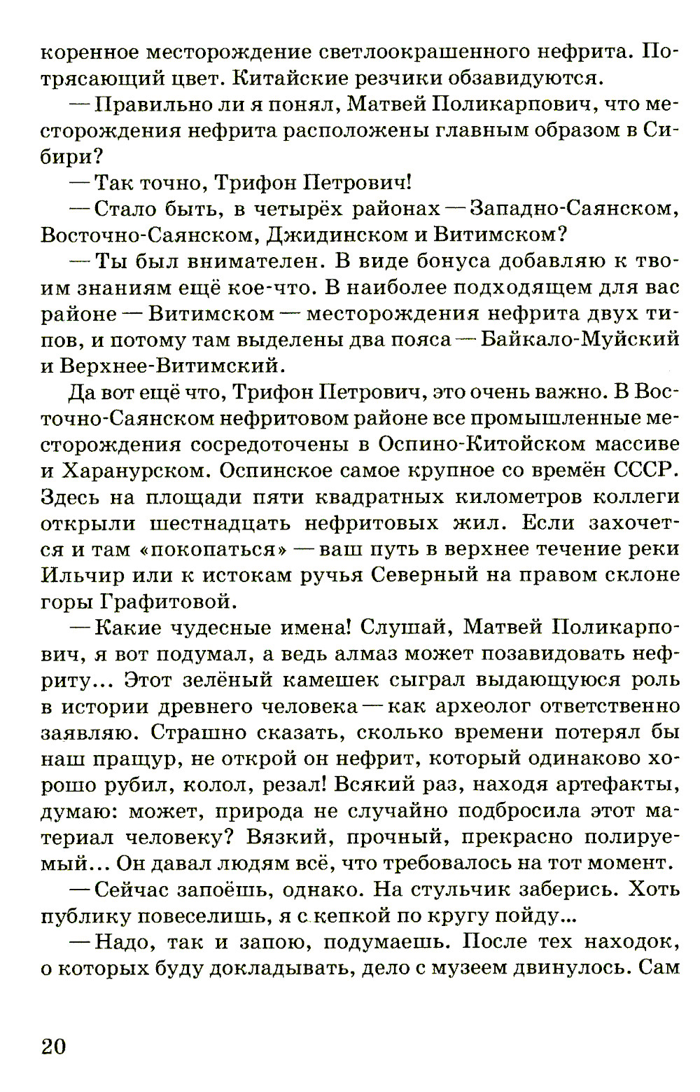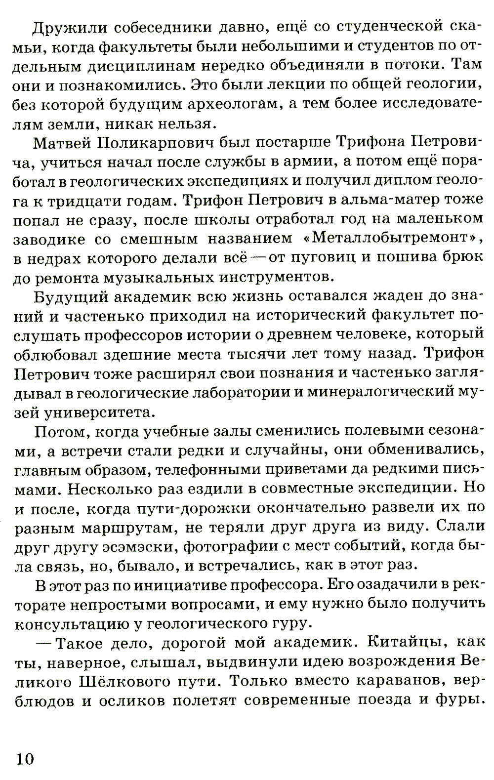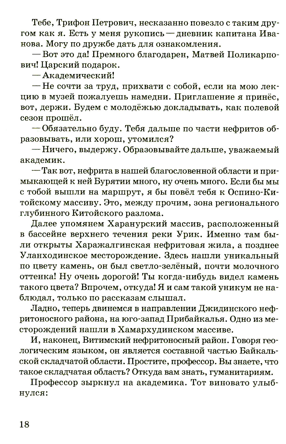 В мире много великих путей, которые связывали страны и народы: Великий Лазуритовый, Шёлковый, Меховой, Чайный, «из варяг в греки»… Но был ещё один, названный по имени камня, который, без всякого преувеличения, сыграл выдающуюся роль в истории человечества - так бесценны оказались его уникальные свойства. Камень обожествляли, наделяли волшебными чертами, считали, что он приносит удачу, счастье, любовь, здоровье, успокоение и многое-многое другое. Камень нефрит дал имя пути - Великий Нефритовый путь. Он объединил множество дорог, по которым зелёный, белый, серый, чёрный, красный, жёлтый и синий нефрит доставлялся жаждущим. Магистральная дорога притягивала к себе множество земель, в которых нефрит добывался, обрабатывался, превращался в произведения великого искусства. Археологические находки доказывали - нефритовые артефакты нередко изготавливались из местного сырья местными мастерами. В этой повести герои, знакомые по удивительным приключениям на Ольхоне («Котёл Чингисхана»), нашедшие сибирский булат и разгадывающие тайны загадочного племени курыкан («Волшебный меч курыкан»), отправляются в новое путешествие, окутанное нефритовыми историями.| Издательство | РуДа |