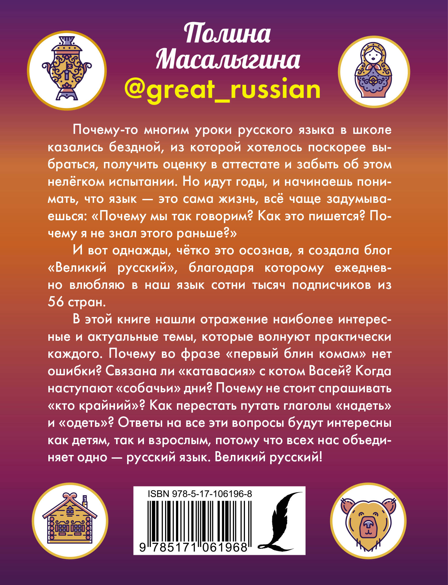 Почему во фразе "первый блин комам" нет ошибки? Связана ли "катавасия" с котом Васей? Когда наступают "собачьи" дни? Почему не стоит спрашивать "кто крайний?" Как перестать путать глаголы "надеть" и "одеть"? Ответы на эти и многие другие нелёгкие вопросы вы найдёте в этой книге. Специально для наших читателей автор популярного в рунете инстаграм-блога "Великий русский" @great_russian Полина Масалыгина переработала и дополнила свои лучшие статьи, в которых раскрывает самые неожиданные подвохи нашего великого русского языка.| Издательство | ИЗДАТЕЛЬСТВО "АСТ" |