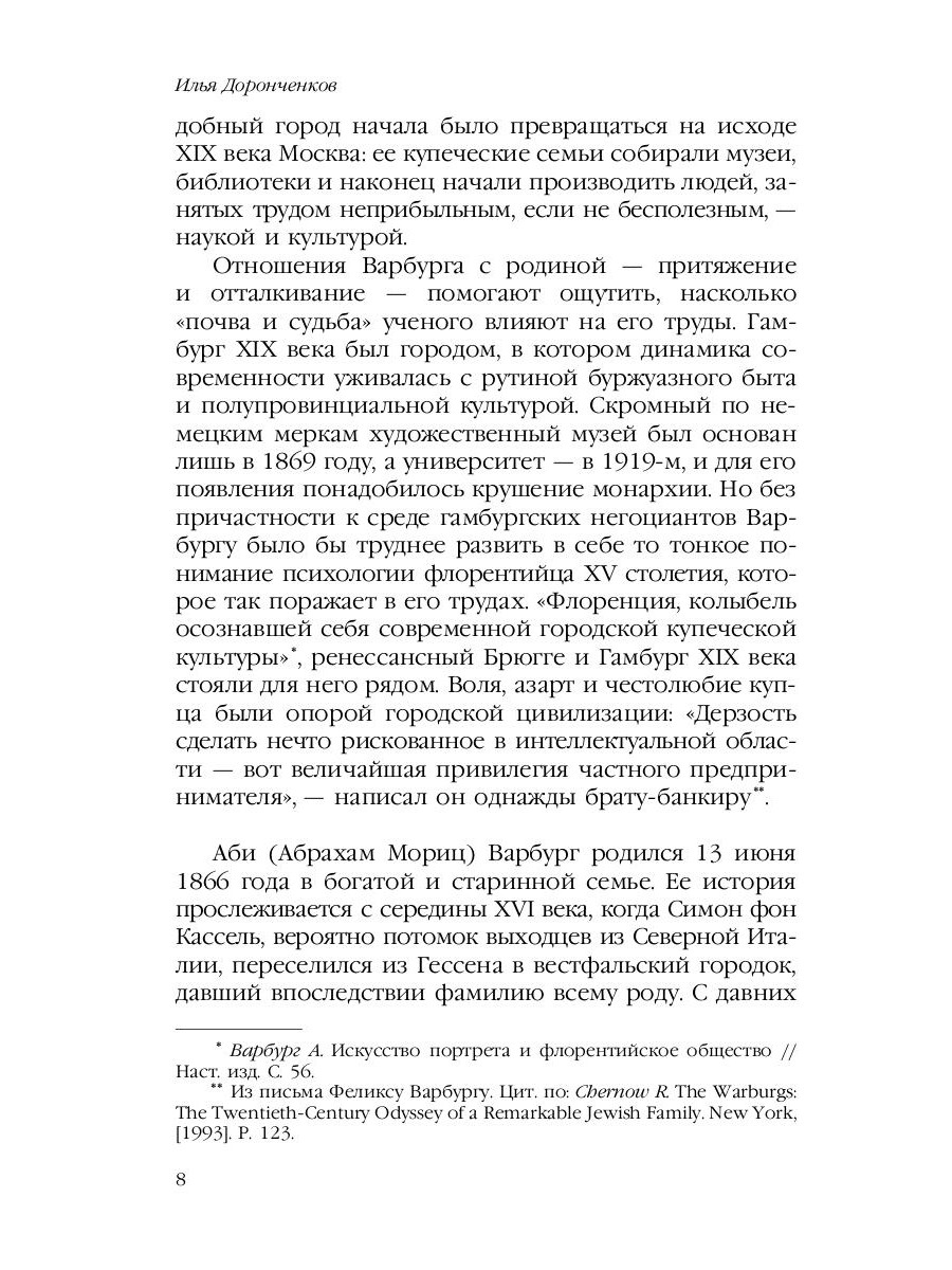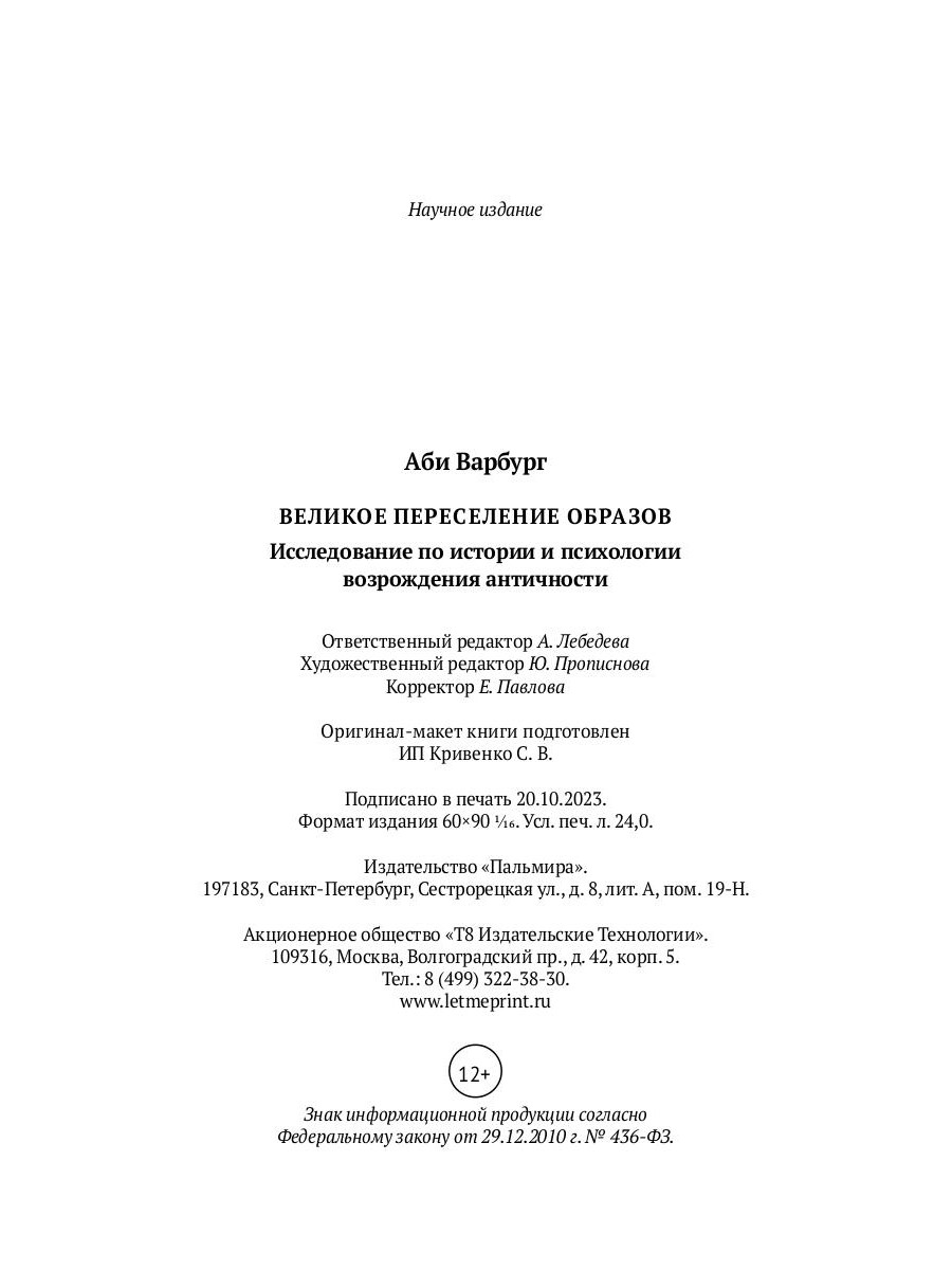Аби Варбург (1866-1929) - выдающийся немецкий историк искусства, стоявший у истоков "иконологического" анализа. С юных лет решив посвятить себя искусствоведению, Варбург отказался продолжить фамильное банковское дело и уступил право наследства младшему брату, взяв с того обещание покупать ему любые книги, необходимые для работы. В течение жизни ученому удалось собрать огромную библиотеку, впоследствии послужившую основой знаменитого института Варбурга в Лондоне. "Великое переселение образов" - сборник из пяти основных работ ученого, созданных в 1902-1929 годах. Уже в этих ранних трудах, не довольствуясь привычными представлениями о Ренессансе как возрождении античности и о Реформации как прогрессивном религиозном перевороте, Варбург пытался проследить непрерывную внутреннюю связь отрицающих друг друга эпох: вечно живую "интуитивную" память образа, жеста, имени и формы. Издание предназначено для искусствоведов, культурологов и всех интересующихся историей искусства.| Издательство | Т8 RUGRAM |