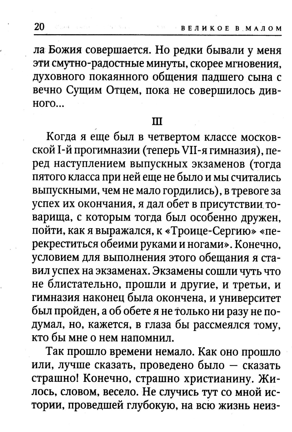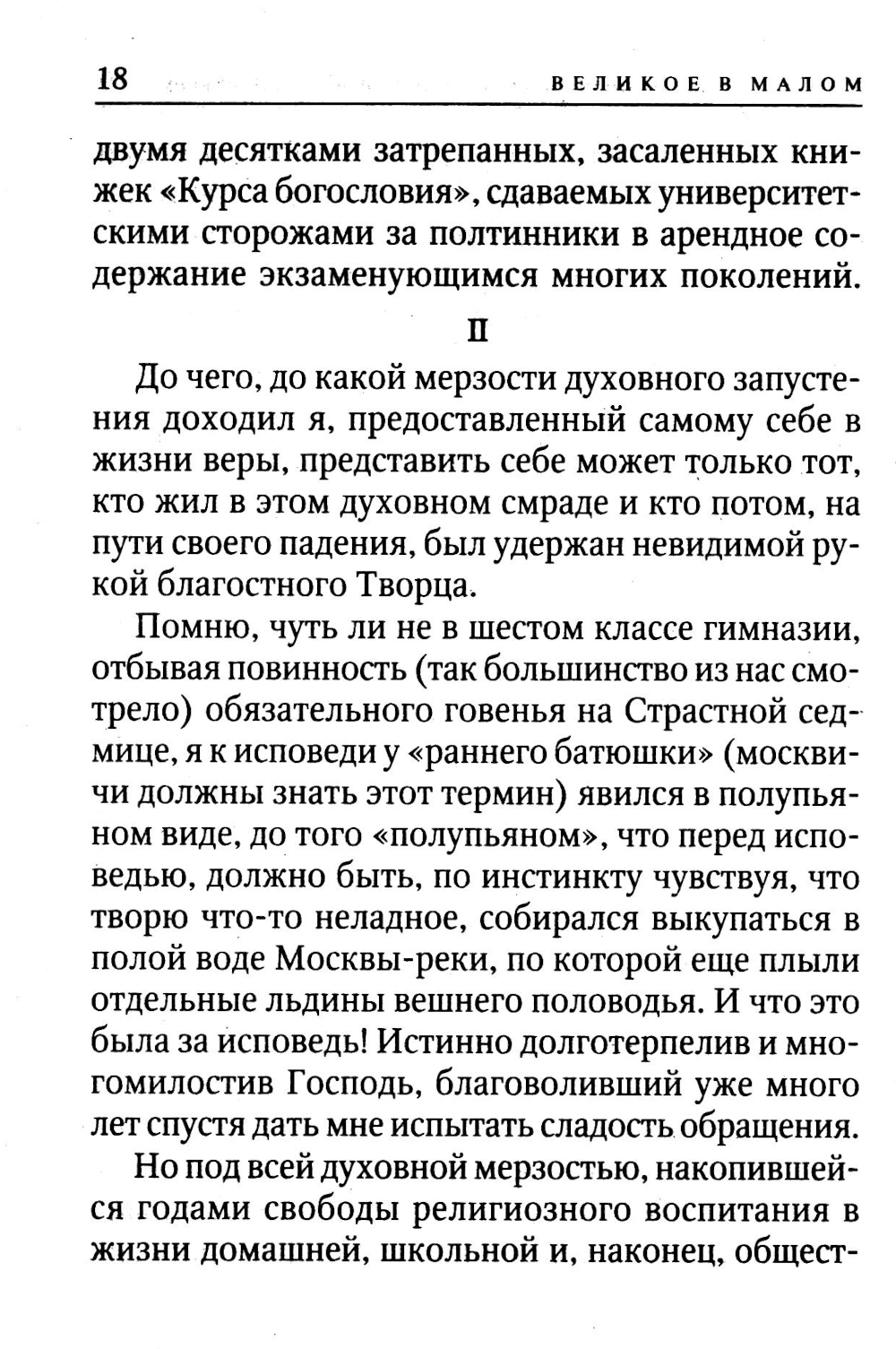 Книга «Великое в малом» была опубликована Сергеем Александровичем Нилусом в 1903 году самой первой из его трудов. И сразу же сделала автора известным и популярным писателем. Только до революции она выдержала несколько переизданий. Записанные им рассказы очевидцев о святых XIX-XX веков и пророчества о судьбах России были столь ярки и убедительны, что Нилус с той поры по праву занимает место в сонме великих духовных писателей России.| Издательство | Терирем |