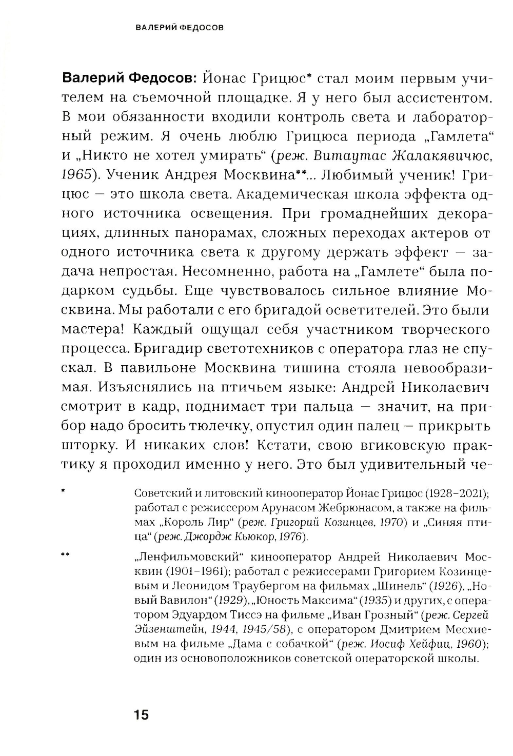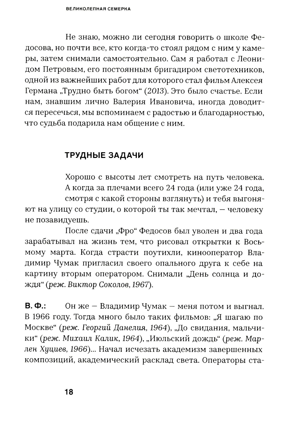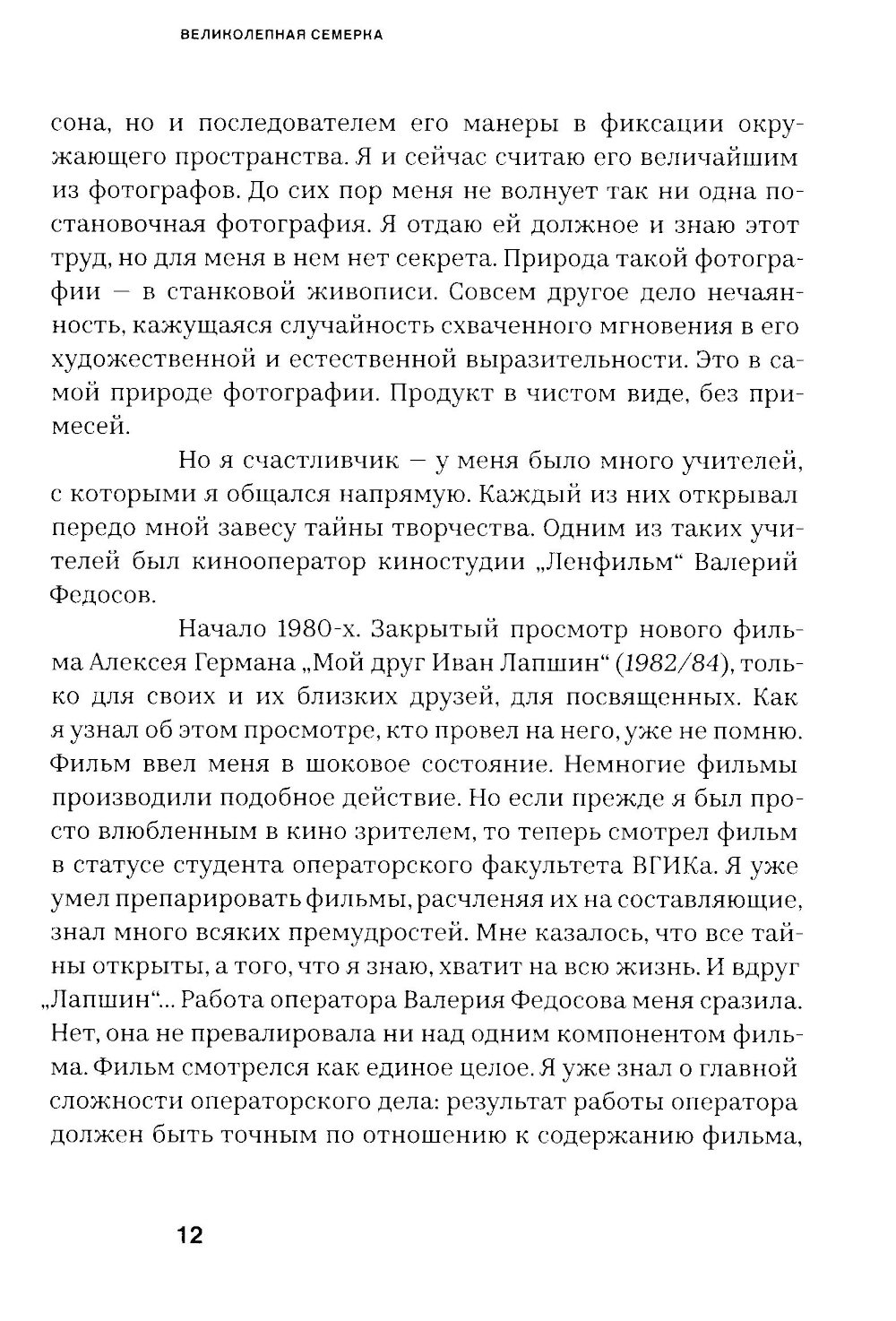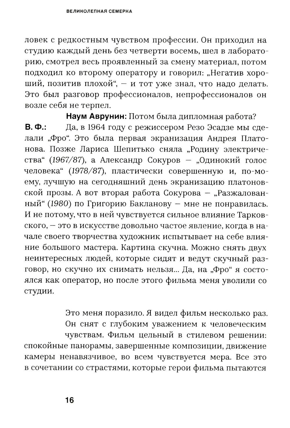 Читателю предлагается семь творческих портретов ленинградских кинооператоров - Валерия Федосова, Сергея Скворцова, Анатолия Лапшова, Сергея Астахова, Дмитрия Долинина, Юрия Шайгарданова и Юрия Векслера, - представленных их коллегой, оператором-документалистом Наумом Авруниным. В беседах об их фильмах поднимаются темы как сугубо профессиональные, так и гуманитарные, культурологические и философские. Данная книга - приглашение в творческую мастерскую важнейшей кинематографической профессии и одновременно попытка рассказать о классических фильмах, создавших славу «ленинградской школе» кино.| Издательство | СЕАНС |