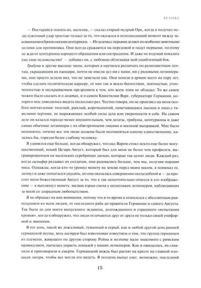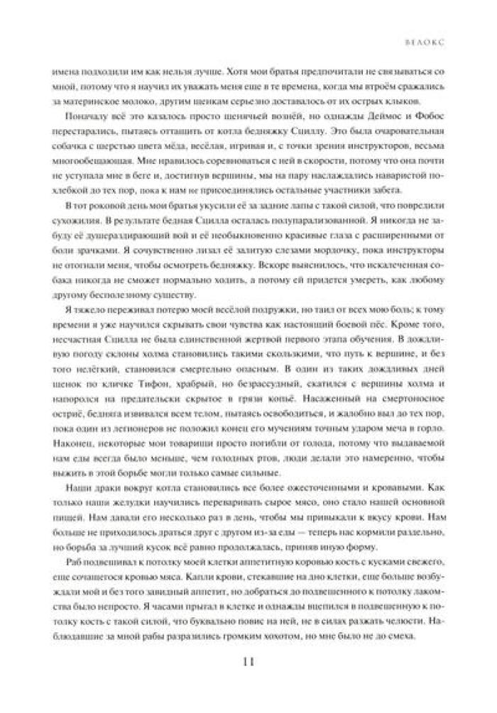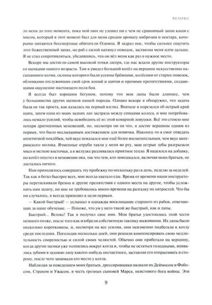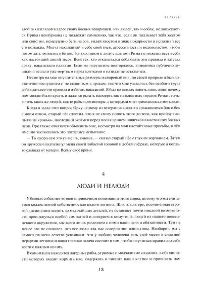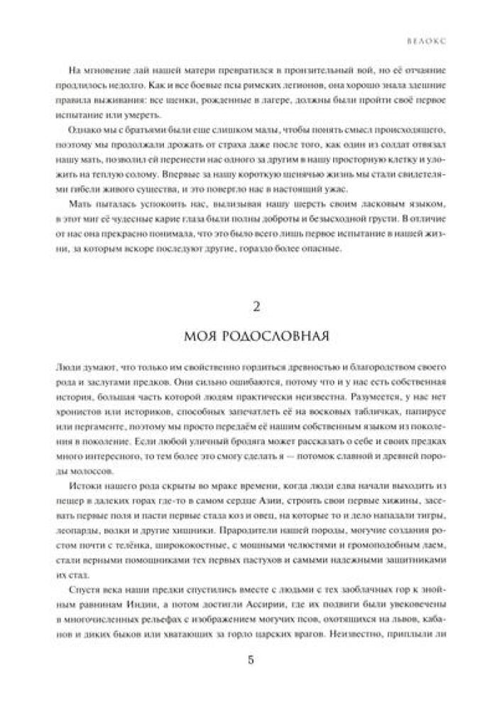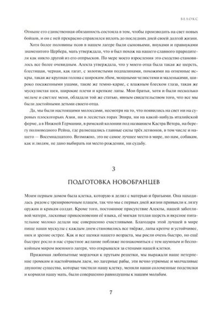Велокс - боевой пёс, потомок легендарных молоссов, рождённый для войны в лагере римских легионеров. Здесь выживают только сильнейшие, а слабых ждёт смерть. Среди строгих законов и вынужденной жестокости зарождается необычная дружба - между боевым псом и молодым легионером Вибием, который видит в Велоксе не просто солдата, но и родственную душу. Их мировоззрение зачастую идет вразрез с армейскими порядками легиона и ставит их перед выбором: слепо подчиниться приказам или сохранить верность себе, даже если это грозит гибелью. «Велокс» - это история о преданности, чести и цене свободы, рассказанная от лица собаки. Война, дружба, предательство и надежда переплетаются в этом пронзительном повествовании, где даже среди крови и железа находится место для любви.| Издательство | Изд.Фабула |