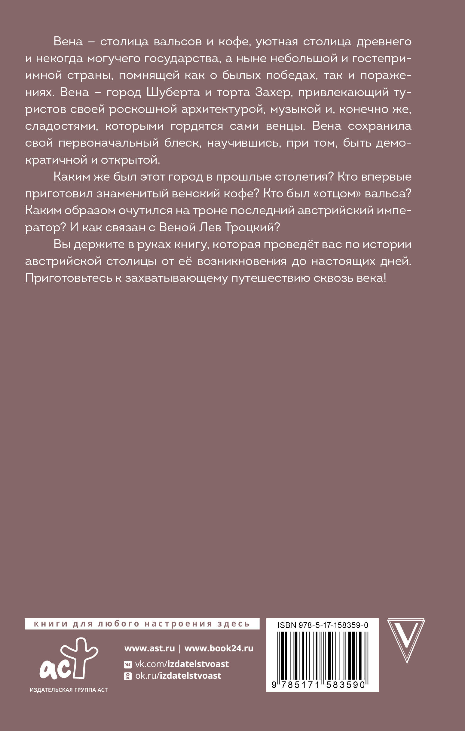 Вена - город вальсов и кофе, уютная столица древнего и некогда могучего государства, а ныне небольшой и гостеприимной страны, помнящей как о былых победах, так и поражениях. Вена - город Шуберта и торта Захер, привлекающий туристов своей роскошной архитектурой, музыкой и, конечно же, сладостями, которыми гордятся сами венцы. Вена сохранила свой первоначальный блеск, научившись, при том, быть демократичной и открытой. Каким же был этот город в прошлые столетия? Кто впервые приготовил знаменитый венский кофе? Кто был "отцом" вальса? Каким образом очутился на троне последний австрийский император? И как связан с Веной Лев Троцкий? Вы держите в руках книгу, которая проведет вас по истории австрийской столицы от ее возникновения до настоящих дней. Приготовьтесь к захватывающему путешествию сквозь века!| Издательство | Издательство "АСТ" |