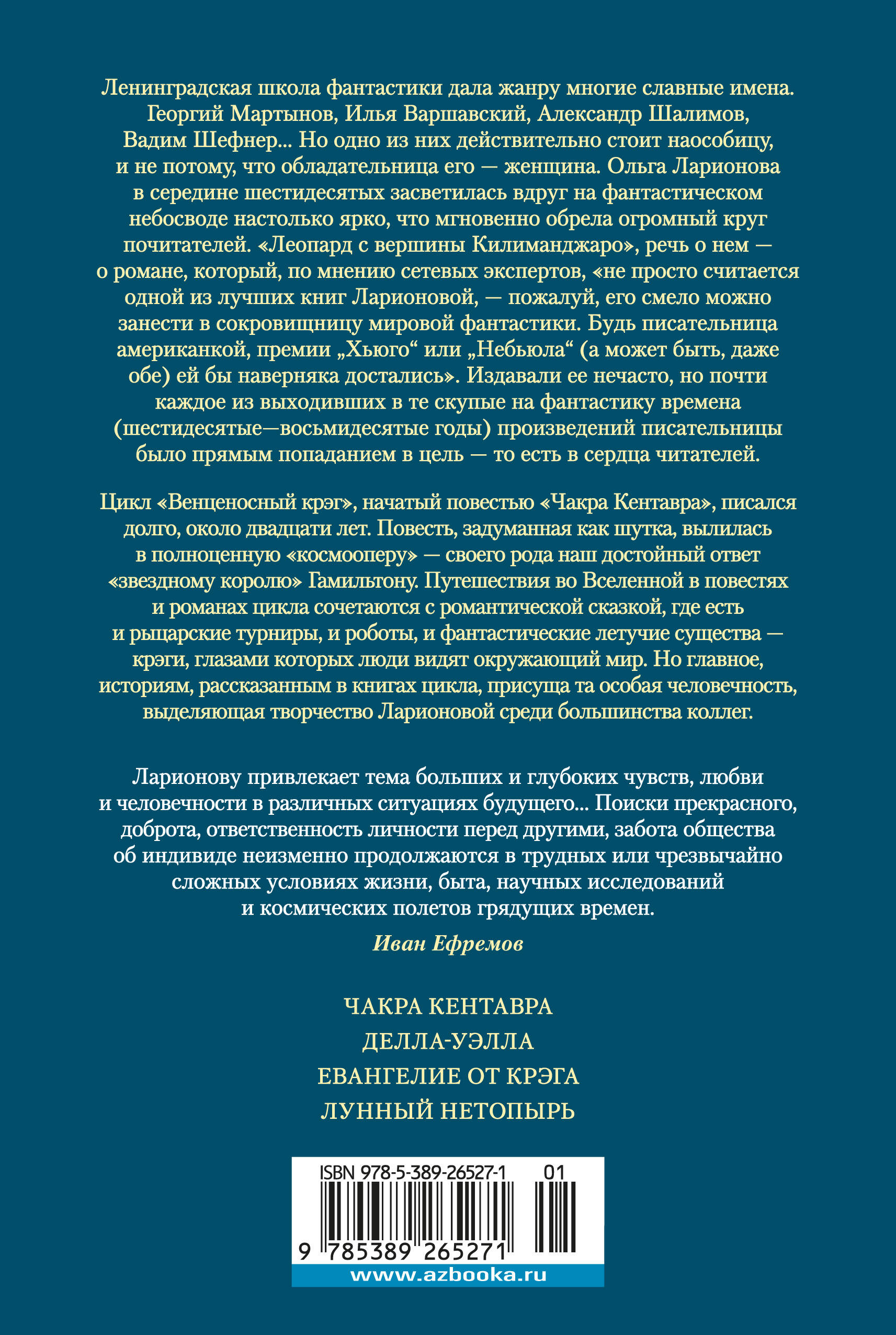 Ленинградская школа фантастики дала жанру многие славные имена. Георгий Мартынов, Илья Варшавский, Вадим Шефнер, Александр Шалимов… Но одно из них действительно стоит наособицу, и не потому, что обладательница его - женщина. Ольга Ларионова в середине шестидесятых засветилась вдруг на фантастическом небосводе настолько ярко, что мгновенно обрела огромный круг почитателей. "Леопард с вершины Килиманджаро", мы говорим о нем - о романе, который, по мнению сетевых экспертов, "не просто считается одной из лучших книг Ларионовой, - пожалуй, его смело можно занести в сокровищницу мировой фантастики. Будь писательница американкой, премии "Хьюго" или "Небьюла" (а может быть, даже обе) ей бы наверняка достались". Издавали ее нечасто, но почти каждое из выходивших в те скупые на фантастику времена (шестидесятые - восьмидесятые годы) произведений писательницы было прямым попаданием в цель - то есть в сердца читателей. Цикл "Венценосный крэг", начатый повестью "Чакра Кентавра", писался долго, около двадцати лет. Повесть, задуманная как шутка, вылилась в полноценную "космооперу" - своего рода наш достойный ответ "звездному королю" Гамильтону. Путешествия во Вселенной в повестях и романах цикла сочетаются с романтической сказкой, где есть и рыцарские турниры, и роботы, и фантастические летучие существа - крэги, глазами которых люди видят окружающий мир. Но главное, историям, рассказанным в книгах цикла, присуща та особая человечность, выделяющая творчество Ларионовой среди большинства коллег.| Издательство | Азбука-Аттикус Издат.группа ООО |