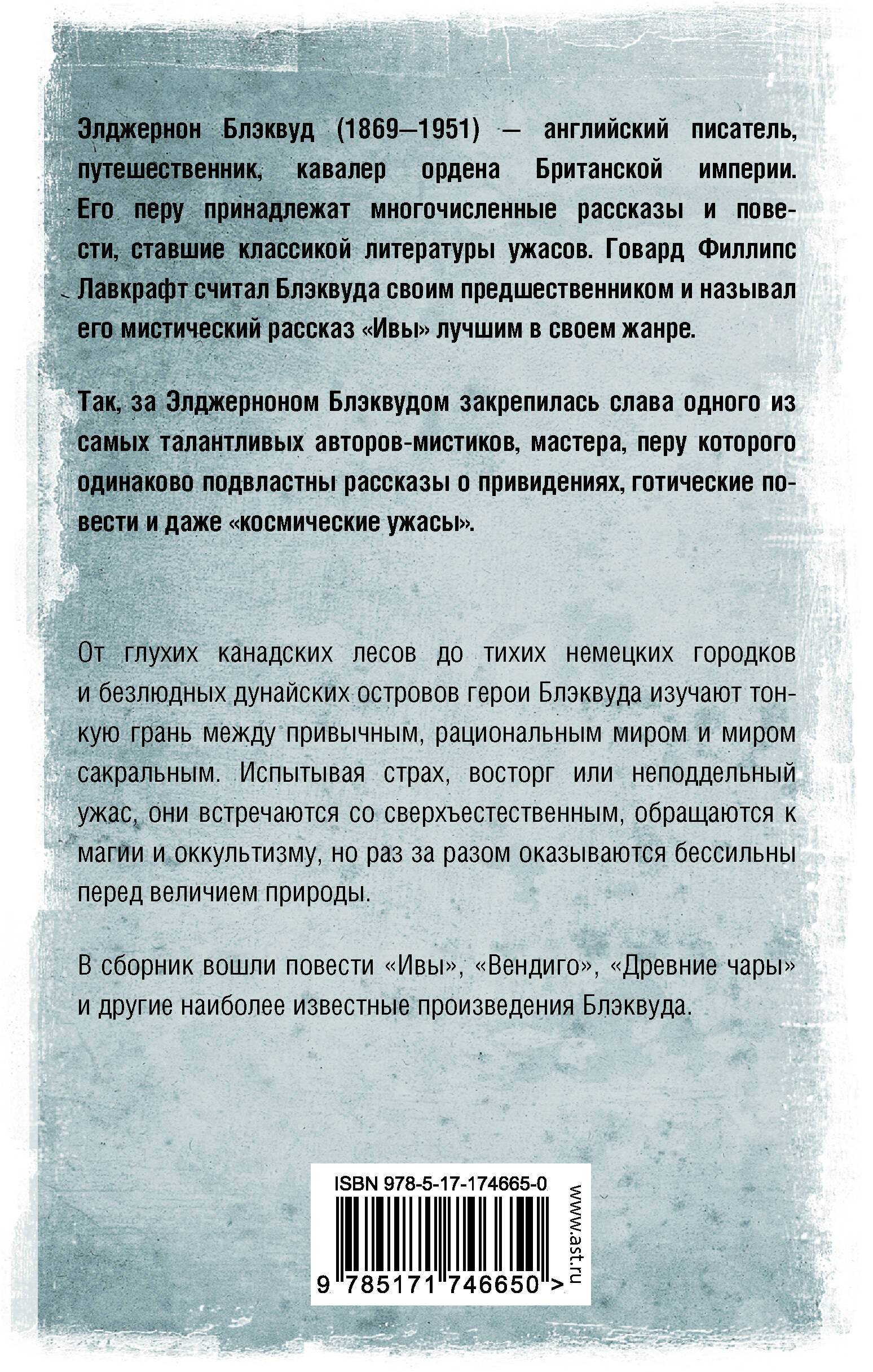 - Элджерон Блэквуд - классик литературы ужасов, один из самых талантливых авторов-мистиков, перу которого с одинаковой легкостью подчинялись рассказы о привидениях, готические повести и даже космические ужасы. - Творчество Блэквуда оказало огромное влияние на таких авторов как Август Дерлет и Говард Филлипс Лавкрафт. - В это издание вошли повести «Ивы», «Вендиго», «Древние чары», «Пустой дом» и другие лучшие образцы малой прозы Блэквуда. - Все повести и рассказы сборника публикуются в переводах Александры Панасюк и Екатерины Романовой.| Издательство | Издательство "АСТ" |