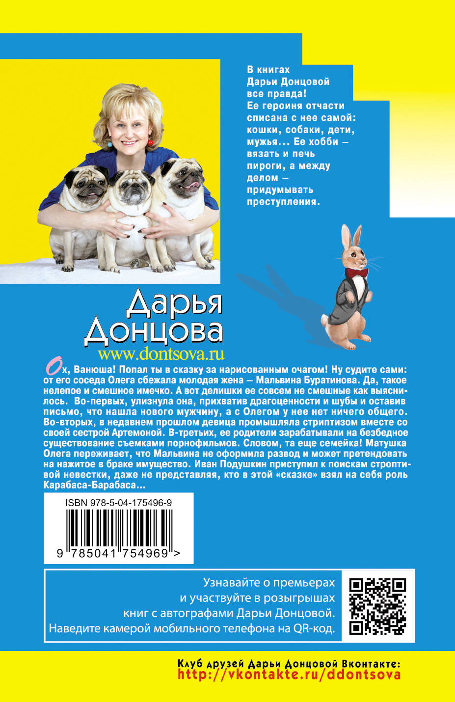 Ох, Ванюша! Попал ты в сказку за нарисованным очагом! Ну, судите сами: от его соседа Олега сбежала молодая жена - Мальвина Буратинова. Да, такое нелепое и смешное имечко. А вот делишки ее совсем не смешные, как выяснилось. Во-первых, улизнула она, прихватив драгоценности и шубы и оставив письмо, что нашла нового мужчину, а с Олегом у нее нет ничего общего. Во-вторых, в недавнем прошлом девица промышляла стриптизом вместе со своей сестрой Артемоной. В-третьих, ее родители зарабатывали на безбедное существование съемками порнофильмов. Словом, та еще семейка! Матушка Олега переживает, что Мальвина не оформила развод и может претендовать на нажитое в браке имущество. Иван Подушкин приступил к поискам строптивой невестки, даже не представляя, кто в этой «сказке» взял на себя роль Карабаса-Барабаса… Дарья Донцова - самый популярный и востребованный автор в нашей стране, любимица миллионов читателей. В России продано более 200 миллионов экземпляров ее книг. Детективы Дарьи Донцовой написаны в особой манере: помимо интереснейшего сюжета, в них всегда присутствует тонкий юмор, здравый оптимизм и безусловная вера в торжество добра над злом. Это всё, что нужно для отдыха, релаксации и душевного успокоения. Прочтите книги Дарьи, и ваши сердца и души наполнятся светом, оптимизмом, радостью, уверенностью в завтрашнем дне! Они заразят вас желанием жить, радоваться каждому дню и верить в лучшее. -------------------------------------------------- «Донцова невероятная работяга! Я не знаю ни одного другого писателя, который столько работал бы. Я отношусь к ней с уважением, как к образцу писательского трудолюбия. Женщины нуждаются в психологической поддержке и получают ее от Донцовой. Я и сама в свое время прочла несколько романов Донцовой. Ее читают очень разные люди. И очень занятые бизнес-леди, чтобы на время выключить голову, и домохозяйки, у которых есть перерыв 15-20 минут между отвести-забрать детей». - Галина Юзефович, литературный критик «У Дарьи вся детективная закваска всего лишь фон для раскрытия характеров, взаимоотношений между людьми. Всегда есть интрига, и до последнего эпизода непонятно, что, как и почему. В этом смысле условия жанра абсолютно выполняются. Дарья Донцова, конечно, одна из лучших». - Дмитрий Харатьян «Давно начала читать, и так втянулась! И сейчас читаю романы Дарьи. Я отдыхаю за ними. Сама Донцова интеллигентная женщина, у нее мягкий юмор и нестрашный сюжет, все с позитивом и надеждой на хороший конец. Это прекрасно». - Лариса Удовиченко