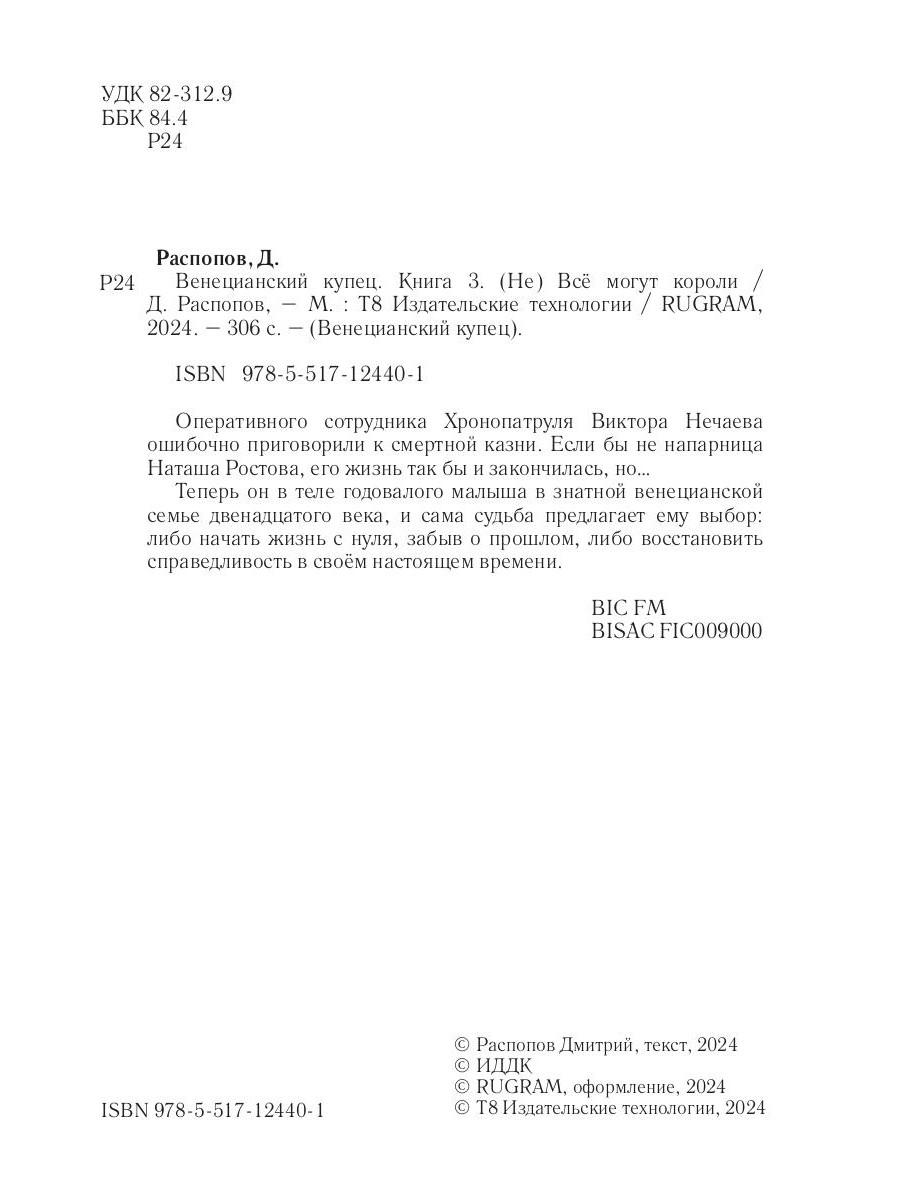 Оперативного сотрудника Хронопатруля Виктора Нечаева ошибочно приговорили к смертной казни. Если бы не напарница Наташа Ростова, его жизнь так бы и закончилась, но… Теперь он в теле годовалого малыша в знатной венецианской семье двенадцатого века, и сама судьба предлагает ему выбор: либо начать жизнь с нуля, забыв о прошлом, либо восстановить справедливость в своём настоящем времени.| Издательство | Т8 RUGRAM |