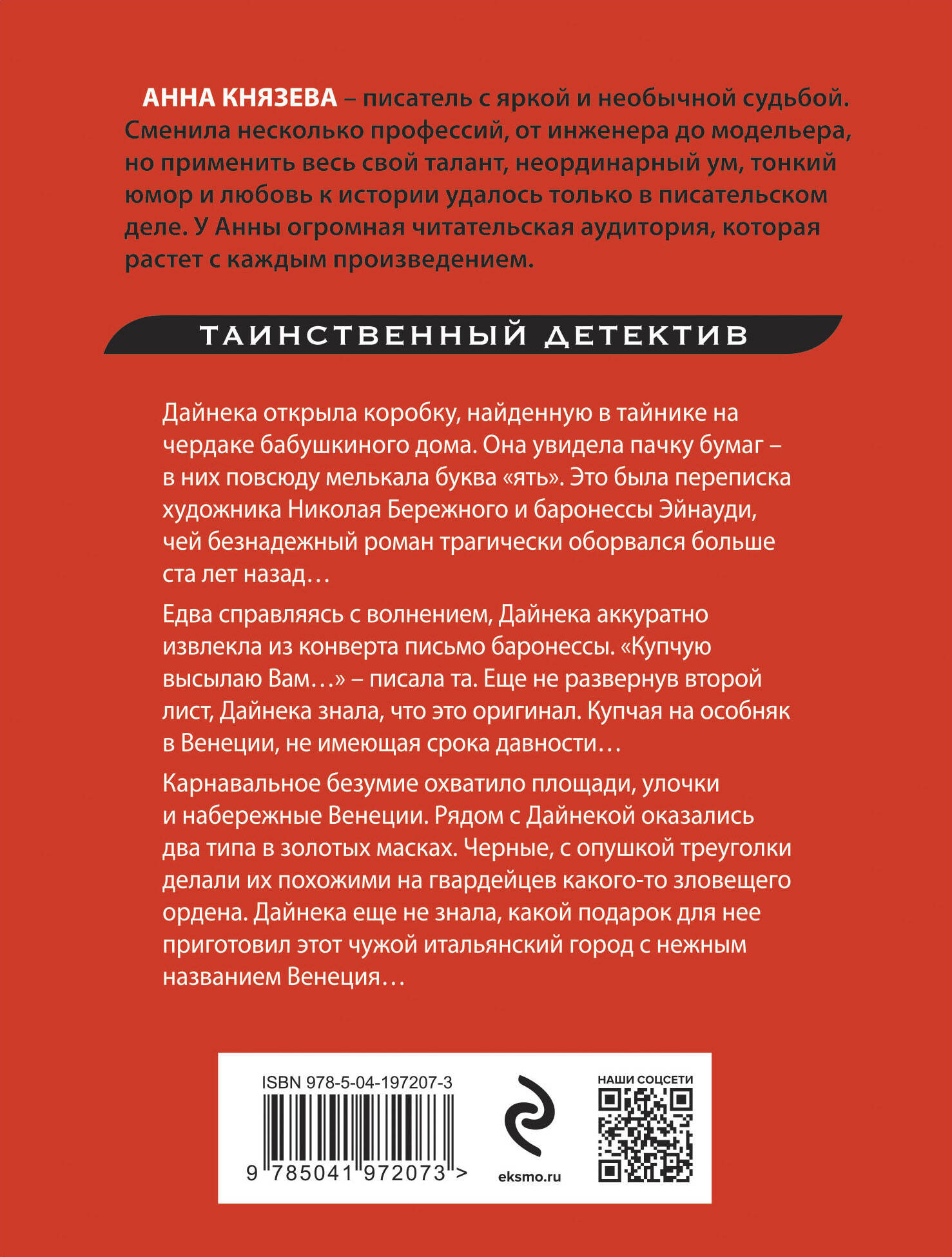 Дайнека открыла коробку, найденную в тайнике на чердаке бабушкиного дома. Она увидела пачку бумаг - в них повсюду мелькала буква «ять». Это была переписка художника Николая Бережного и баронессы Эйнауди, чей безнадежный роман трагически оборвался больше ста лет назад… Едва справляясь с волнением, Дайнека аккуратно извлекла из конверта письмо баронессы. «Купчую высылаю Вам…», - писала та. Еще не развернув второй лист, Дайнека знала, что это оригинал. Купчая на особняк в Венеции, не имеющая срока давности… Карнавальное безумие охватило площади, улочки и набережные Венеции. Рядом с Дайнекой оказались два типа в золотых масках. Черные, с опушкой, треуголки делали их похожими на гвардейцев какого-то зловещего ордена. Дайнека еще не знала, какой подарок для нее приготовил этот чужой итальянский город с нежным названием Венеция… В остросюжетных романах Анны Князевой расследуются преступления, следы которых уводят в прошлое и позволяют пролить свет на его загадки. Вслед за героями вы отправитесь навстречу старинным тайнам и увлекательным приключениям!| Издательство | ООО "Издательство "Эксмо" |
