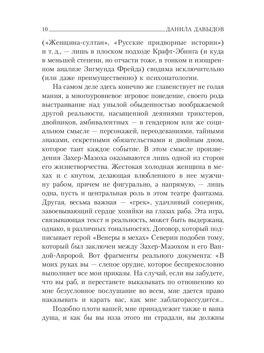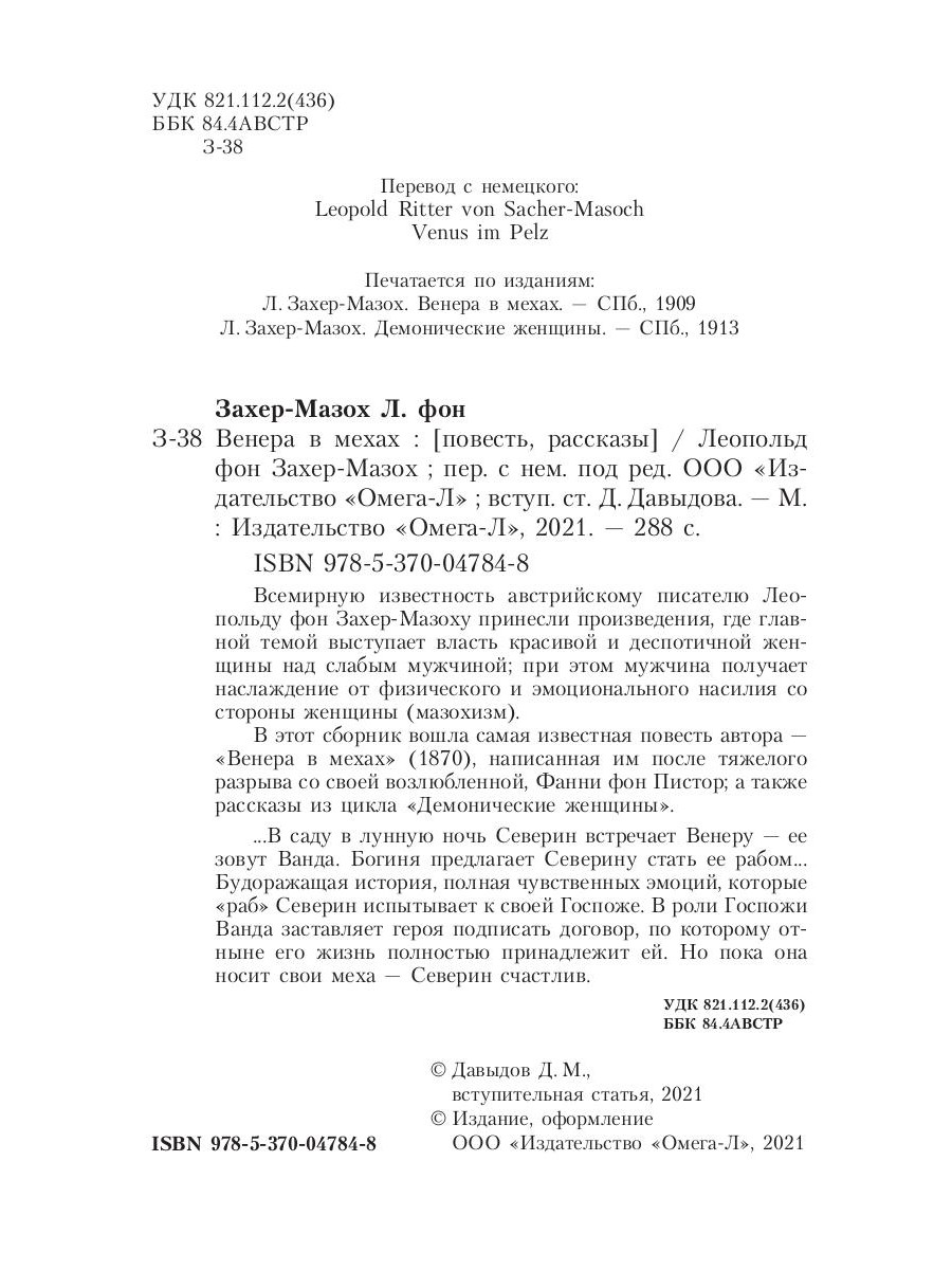 Всемирную известность австрийскому писателю Леопольду фон Захер-Мазоху принесли произведения, где главной темой выступает власть красивой и деспотичной женщины над слабым мужчиной; при этом мужчина получает наслаждение от физического и эмоционального насилия со стороны женщины (мазохизм). В этот сборник вошла самая известная повесть автора - «Венера в мехах» (1870), написанная им после тяжелого разрыва со своей возлюбленной, Фанни фон Пистор; а также рассказы из цикла «Демонические женщины». ...В саду в лунную ночь Северин встречает Венеру - ее зовут Ванда. Богиня предлагает Северину стать ее рабом... Будоражащая история, полная чувственных эмоций, которые «раб» Северин испытывает к своей Госпоже. В роли Госпожи Ванда заставляет героя подписать договор, по которому отныне его жизнь полностью принадлежит ей. Но пока она носит свои меха - Северин счастлив.| Издательство | Омега-Л |