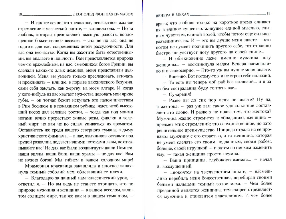 Всемирную известность австрийскому писателю Леопольду фон Захер-Мазоху принесли произведения, где главной темой выступает власть красивой и деспотичной женщины над слабым мужчиной; при этом мужчина получает наслаждение от физического и эмоционального насилия со стороны женщины (мазохизм). В этот сборник вошла самая известная повесть автора - «Венера в мехах» (1870), написанная им после тяжелого разрыва со своей возлюбленной, Фанни фон Пистор; а также рассказы из цикла «Демонические женщины». ...В саду в лунную ночь Северин встречает Венеру - ее зовут Ванда. Богиня предлагает Северину стать ее рабом... Будоражащая история, полная чувственных эмоций, которые «раб» Северин испытывает к своей Госпоже. В роли Госпожи Ванда заставляет героя подписать договор, по которому отныне его жизнь полностью принадлежит ей. Но пока она носит свои меха - Северин счастлив.| Издательство | Омега-Л |