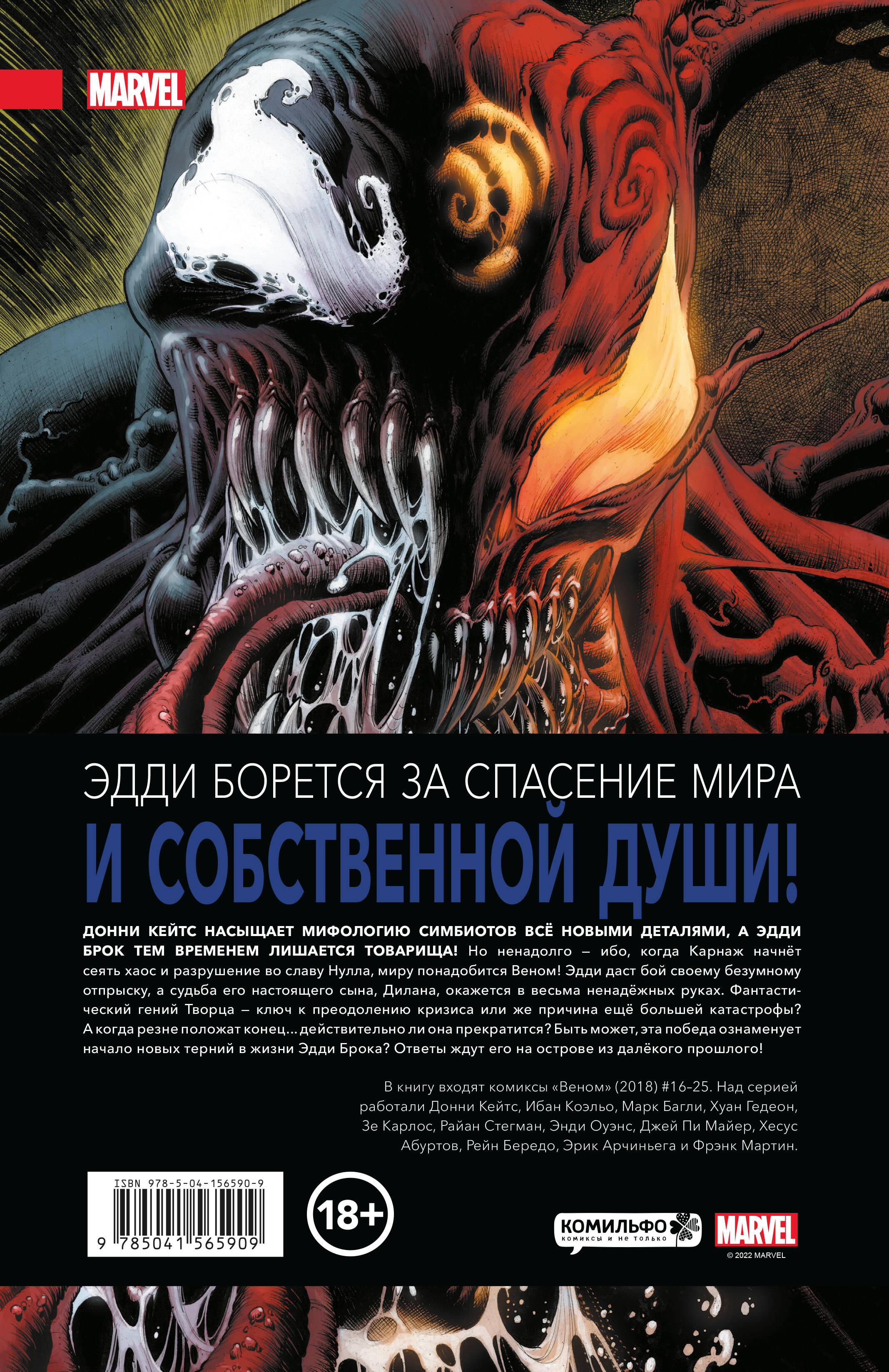 Эдди борется за спасение мира и собственной души! Донни Кейтс насыщает мифологию симбиотов всё новыми деталями, а Эдди Брок тем временем лишается товарища! Но ненадолго - ибо, когда Карнаж начнёт сеять хаос и разрушение во славу Нулла, миру понадобится Веном! Эдди даст бой своему безумному отпрыску, а судьба его настоящего сына, Дилана, окажется в весьма ненадёжных руках. Фантастический гений Творца - ключ к преодолению кризиса или же причина ещё большей катастрофы? А когда резне положат конец... действительно ли она прекратится? Быть может, эта победа ознаменует начало новых терний в жизни Эдди Брока? Ответы ждут его на острове из далёкого прошлого! В книгу входят комиксы «Веном» (2018) #16-25. Над серией работали Донни Кейтс, Ибан Коэльо, Марк Багли, Хуан Гедеон, Зе Карлос, Райан Стегман, Энди Оуэнс, Джей Пи Майер, Хесус Абуртов, Рейн Бередо, Эрик Арчиньега и Фрэнк Мартин.