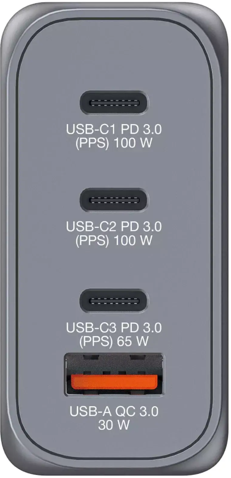 <ul><br /> <li><br /> <p class="ds-markdown-paragraph">Компактный 4-портовый зарядник (3× USB-C PD + 1× USB-A QC 3.0) с технологией GaN</p><br /> </li><br /> <li><br /> <p class="ds-markdown-paragraph">Максимальная мощность 100W: 2× USB-C PD 100W, 1× USB-C PD 65W, 1× USB-A QC 3.0 18W</p><br /> </li><br /> <li><br /> <p class="ds-markdown-paragraph">Совместимость с розетками EU/UK/US (складная вилка US + сменные адаптеры EU/UK)</p><br /> </li><br /> <li><br /> <p class="ds-markdown-paragraph">Защита от перегрузки, перегрева и короткого замыкания</p><br /> </li><br /> <li><br /> <p class="ds-markdown-paragraph">Огнестойкий корпус из поликарбоната</p><br /> </li><br /> </ul>