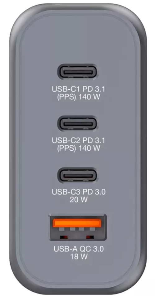 <p>Тип зарядного устройства: Крытый<br>Тип источника питания: переменный ток<br>Совместимость зарядного устройства: универсальное<br>Входное напряжение: 100-240 В<br>Максимальное выходное напряжение: 20 В<br>Количество портов USB Type-C: 3 (2 x USB-C PD 140 Вт, 1 x USB-C PD 20 Вт)<br>Количество портов USB-A: 1 (USB-A QC 3.0)<br>Быстрая зарядка: Да<br>Описание защиты по питанию: перегрузка по току, перенапряжение, перегрев, короткое замыкание<br>Цвет товара: черный, серый<br>Региональные версии: ЕС/Великобритания/США.<br>Используемая технология: GaN (нитрид галлия).<br>Общая мощность: 140 Вт</p>