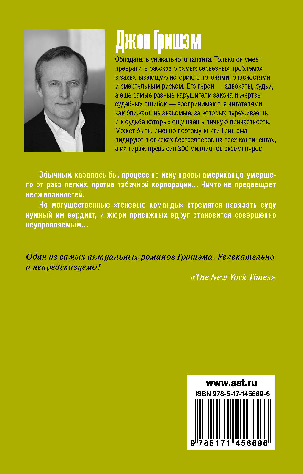 Обычный, казалось бы, процесс по иску вдовы американца, умершего от рака легких, против табачной корпорации… Ничто не предвещает неожиданностей. Но могущественные "теневые команды" стремятся навязать суду нужный им вердикт, и жюри присяжных вдруг становится совершенно неуправляемым…