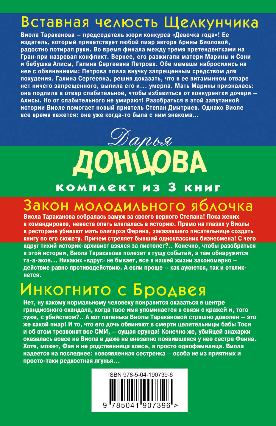 Комплект из 3-х книг, в который входят романы «Вставная челюсть Щелкунчика», «Закон молодильного яблочка», «Инкогнито с Бродвея». «Вставная челюсть Щелкунчика» Виола Тараканова - председатель жюри конкурса «Девочка года»! Ее издатель, который приветствует любой пиар автора Арины Виоловой, радостно потирал руки. Во время финала между тремя претендентками на Гран-при назревал конфликт. Вернее, его разжигали матери Марины и Сони и бабушка Алисы, Галина Сергеевна Петрова. Обе мамаши набросились на нее с обвинениями: Петрова поила внучку запрещенным средством для похудания. Галина Сергеевна, решив доказать, что в ее витаминном отваре нет ничего запрещенного, выпила его и... умерла. Мать Марины призналась: она подлила в отвар слабительное, чтобы избавиться от конкурентки дочери - Алисы. Но от слабительного не умирают! Разобраться в этой запутанной истории Виоле помогает новый приятель Степан Дмитриев. Однако Виоле все время кажется: она уже когда-то была с ним знакома… «Закон молодильного яблочка» Виола Тараканова собралась замуж за своего верного Степана! Пока жених в командировке, невеста опять вляпалась в историю. Прямо на глазах у Виолы в ресторане убивают мать олигарха Ферина, заказавшего писательнице создать книгу по его сюжету. Причем стреляет бывший одноклассник бизнесмена! С чего вдруг тихий историк-архивист взялся за пистолет?.. Конечно, чтобы разобраться в этой истории, Виола Тараканова полезет в гущу событий, а там обнаружится та-а-акое... Никаких «вдруг» не бывает, все в нашей жизни закономерно - действие равно противодействию. А если проще - как аукнется, так и откликнется. Сделал что-то дурное в юности, это дурное тебя через много лет настигнет… «Инкогнито с Бродвея» Нет, ну какому нормальному человеку понравится оказаться в центре грандиозного скандала, когда твое имя упоминается в связи с кражей и, того хуже, с убийством?.. А вот папенька Виолы Таракановой страшно доволен - это же какой пиар! И то, что его дочь обвиняют в смерти целительницы бабы Тоси, и об этом трезвонят все СМИ, - сущая ерунда! Конечно же, убийцей знахарки оказалась вовсе не Виола, и даже не внезапно появившаяся у нее сестра Фаина. Хотя, может, Фая и не родственница вовсе, а просто однофамилица. Виола надеется на последнее: новоявленная сестренка - особа не из приятных и просто-таки редкостная лгунья...