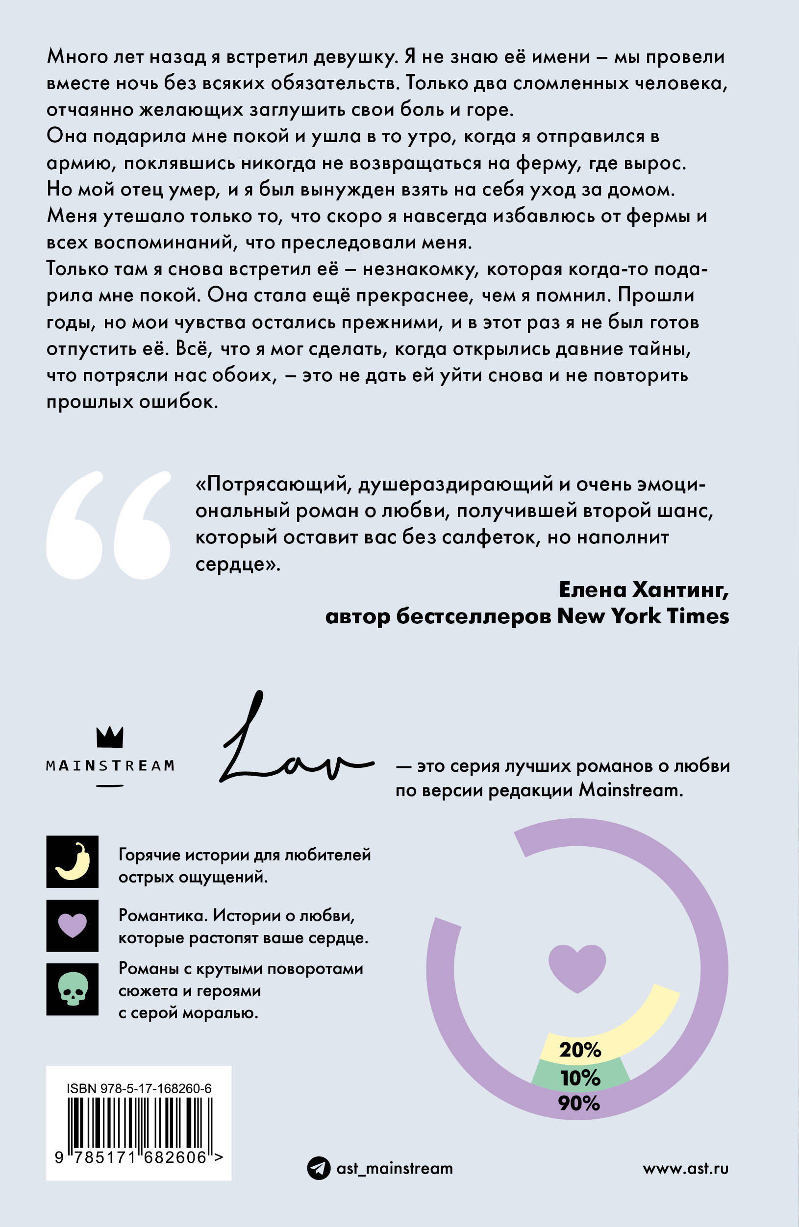 Однажды ночью, восемь лет назад, Она подарила мне мир. Никаких имен. Никаких обещаний. Только два сломленных человека, отчаянно желающих заглушить свои боль и горе. Утром Она ушла, забрав с собой и мое утешение. В тот день я ушел в армию, поклявшись никогда не возвращаться в этот маленький городок в Пенсильвании. Когда мой отец умирает, я вынужден приехать домой на похороны. По крайней мере, я наконец-то избавлюсь от его фермы, заросшей и полной воспоминаний, которых я старался избегать. И тут я нахожу Ее. Она еще прекраснее, чем я помню, и у нее самый очаровательный ребенок, которого я когда-либо видел. Прошли годы, но мои чувства остались прежними, и на этот раз я отказываюсь Ее отпускать. Говорят, нельзя похоронить прошлое, и это правда. Когда открываются давние тайны, которые потрясают нас обоих до глубины души, у меня не остается выбора, кроме как смотреть, как Она снова уходит...| Издательство | Издательство "АСТ" |