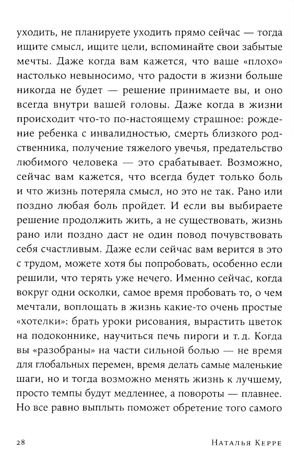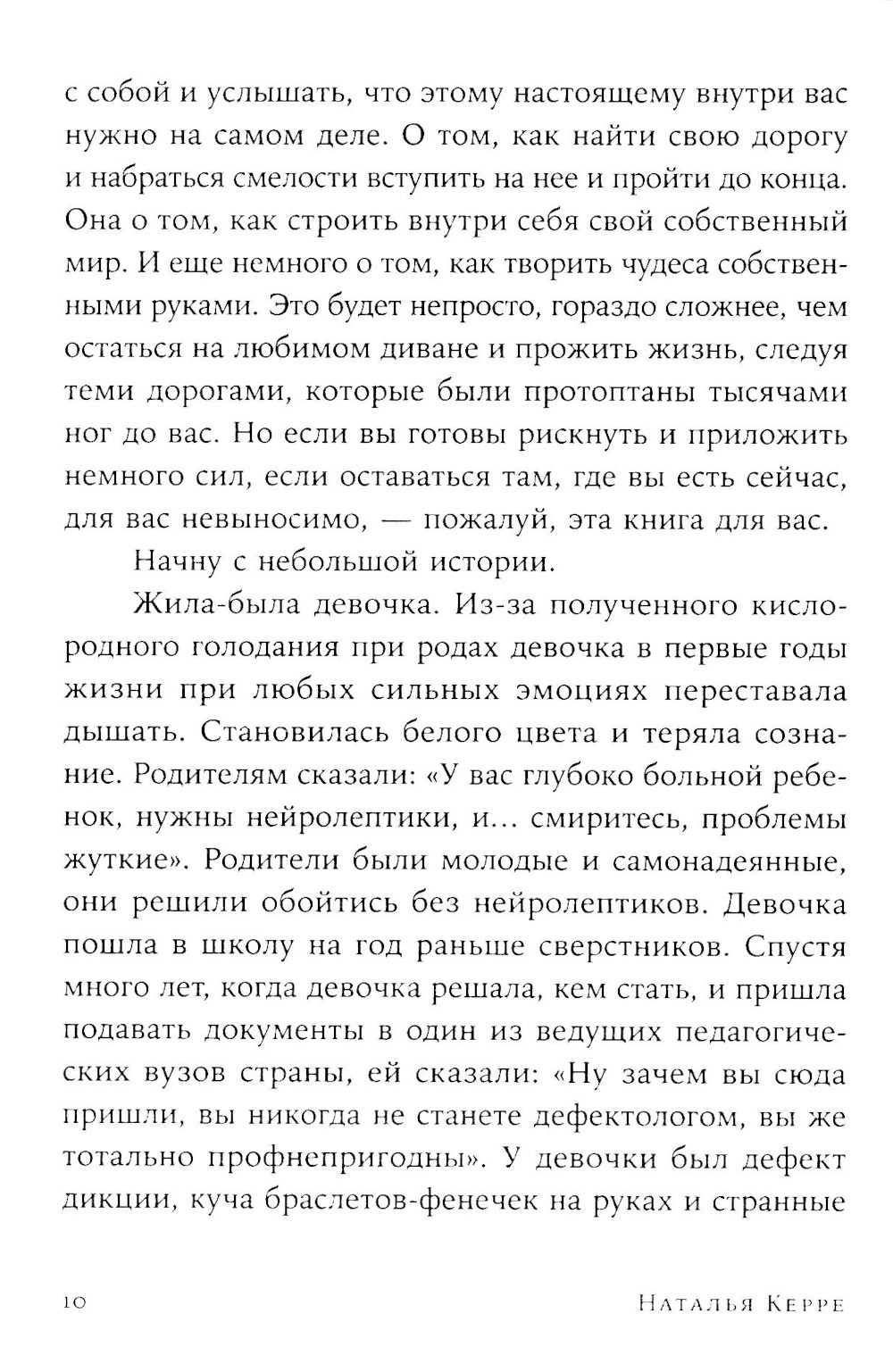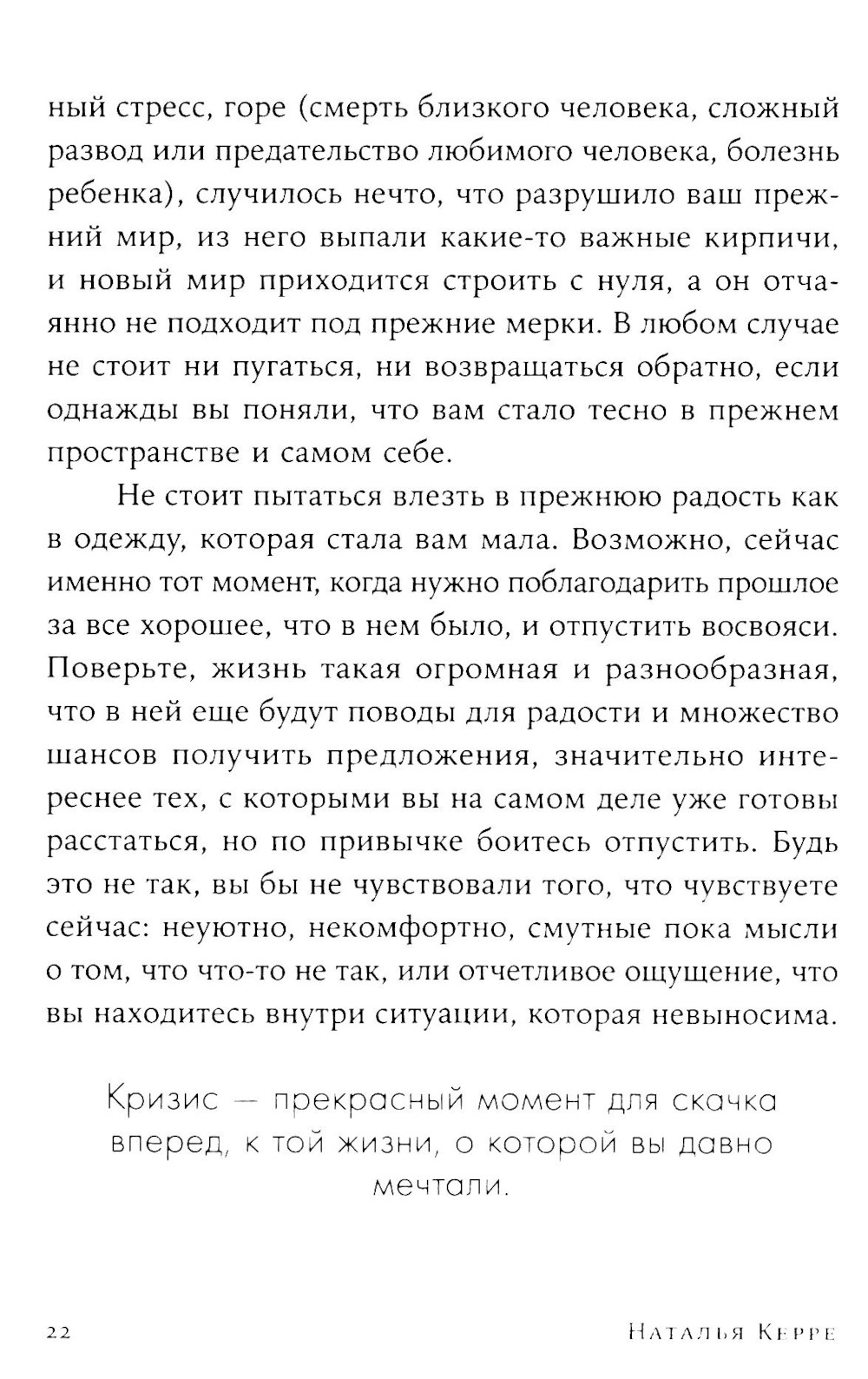 Эта книга не о том, как заработать миллион, моментально достичь процветания в бизнесе и очаровать всех людей на пару километров вокруг. Она о том, как понять, чего вы хотите на самом деле, и разрешить себе стремиться к цели, пусть даже другие крутят пальцем у виска. Ее автор, психолог-консультант Наталья Керре, поможет вам понять и полюбить самих себя - настоящих, без навязанных обществом масок. Она пишет о том, что останавливаться необязательно в любом возрасте, а делать всегда по-своему - добродетель, ведущая напрямик к счастью. Если вы хотите выбраться из состояния «всё хорошо, но ничего хорошего» и сделать свою жизнь такой, какую раньше не могли даже вообразить, скорее переворачивайте страницу и читайте.| Издательство | Альпина Паблишер |