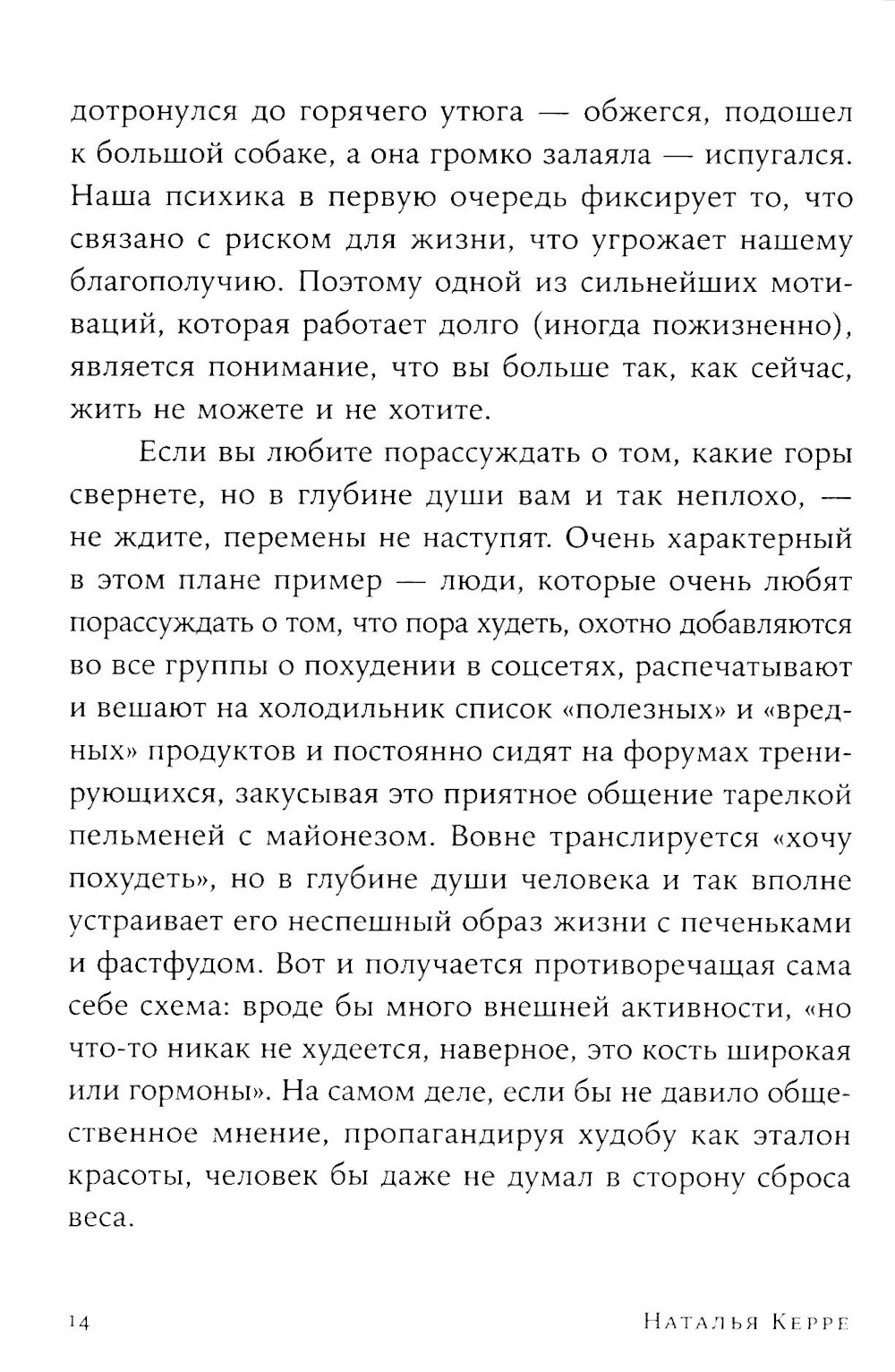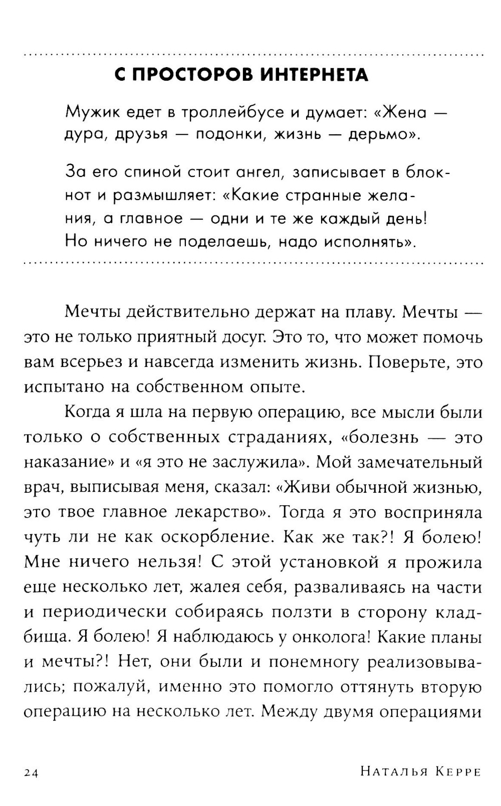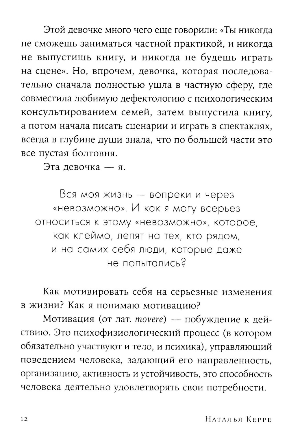 Эта книга не о том, как заработать миллион, моментально достичь процветания в бизнесе и очаровать всех людей на пару километров вокруг. Она о том, как понять, чего вы хотите на самом деле, и разрешить себе стремиться к цели, пусть даже другие крутят пальцем у виска. Ее автор, психолог-консультант Наталья Керре, поможет вам понять и полюбить самих себя - настоящих, без навязанных обществом масок. Она пишет о том, что останавливаться необязательно в любом возрасте, а делать всегда по-своему - добродетель, ведущая напрямик к счастью. Если вы хотите выбраться из состояния «всё хорошо, но ничего хорошего» и сделать свою жизнь такой, какую раньше не могли даже вообразить, скорее переворачивайте страницу и читайте.| Издательство | Альпина Паблишер |