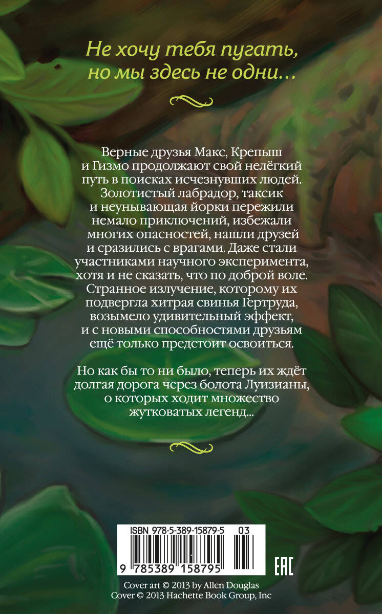 Верные друзья Макс, Крепыш и Гизмо продолжают свой нелёгкий путь в поисках исчезнувших людей. Золотистый лабрадор, таксик и неунывающая йорки пережили немало приключений, избежали множества опасностей, нашли друзей и сразились с врагами. Даже стали участниками научного эксперимента, хотя и не сказать, что по доброй воле. Странное излучение, которому их подвергла хитрая свинья Гертруда, возымело удивительный эффект, и с новыми способностями друзьям ещё только предстоит освоиться. Но как бы то ни было, теперь их ждёт долгая дорога через болота Луизианы, о которых ходит множество жутковатых легенд…| Издательство | Азбука-Аттикус Издат.группа ООО |