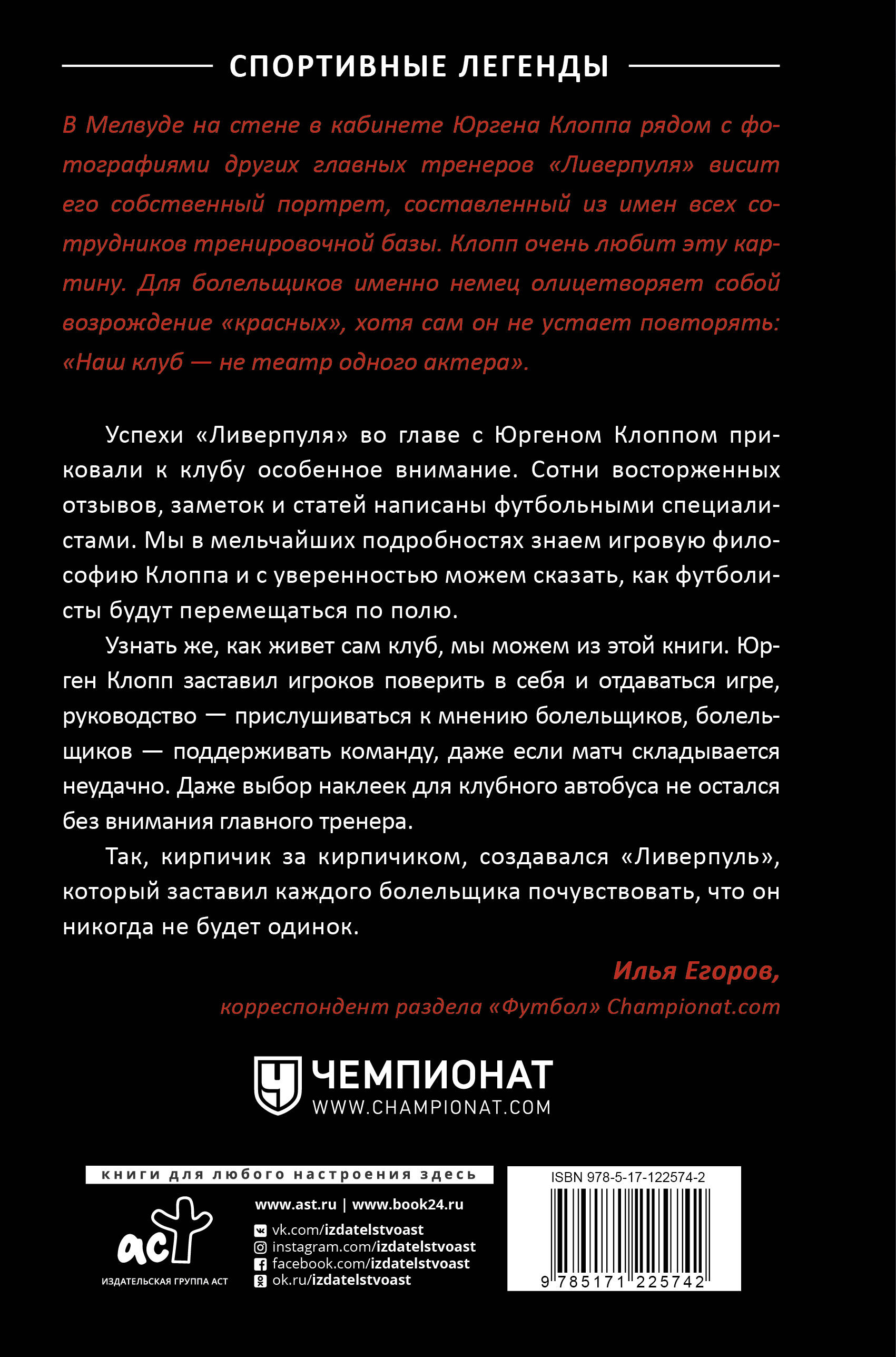 В 2019 году "Ливерпуль" одержал победу в Лиге чемпионов, а в 2020-м добыл долгожданное чемпионство в Английской премьер лиге. Успехи команды последних лет связаны с Юргеном Клоппом, начавшим планомерную перестройку команды. Мелисса Редди описывает непростой путь, который пришлось пройти игрокам во главе с тренером, чтобы вернуться на вершину британского и мирового футбола. Из уст всех участников и свидетелей перемен вам предстоит узнать, как Юрген Клопп трансформировал "Ливерпуль": от психологии игроков и взаимоотношений с болельщиками до стиля игры и управления командой. Юрген Клопп призывал игроков верить в себя, а болельщиков - верить в команду. И это сплотило всех, для кого "Ливерпуль" - не просто слово.| Издательство | Издательство "АСТ" |