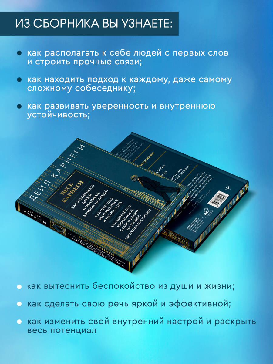 Эксклюзивное издание сборника Дейла Карнеги с цветным обрезом станет прекрасным подарком и украшением домашней библиотеки. Издание включает в себя три самые популярные книги Дейла Карнеги, признанные во всем мире лучшими практическими руководствами для овладения навыками эффективного общения, ярких публичных выступлений и управления тревожностью. Методики Карнеги остаются актуальными и пользуются популярностью у читателей и по сей день. Вы найдете проверенные временем рекомендации и советы о том, как расположить к себе любого человека, справиться с тревогой и беспокойством, а также стать убедительным оратором, способным влиять на аудиторию. Приемы и методы Дейла Карнеги может легко освоить любой человек - это и конкретные шаги, и отличная мотивация для изменения жизни к лучшему прямо сейчас! Трилогию называют золотой классикой саморазвития, обязательной для каждого, кто интересуется психологией. Три книги, входящие в это издание, с момента первой публикации проданы тиражом более 60 миллионов экземпляров на 80 языках мира! Из сборника вы узнаете: • как располагать к себе людей с первых слов и строить прочные связи; • как находить подход к каждому, даже самому сложному собеседнику; • как развивать уверенность и внутреннюю устойчивость; • как вытеснить беспокойство из души и жизни; • как сделать свою речь яркой и эффективной; • как изменить свой внутренний настрой и раскрыть весь потенциал.| Издательство | Издательство "АСТ" |
