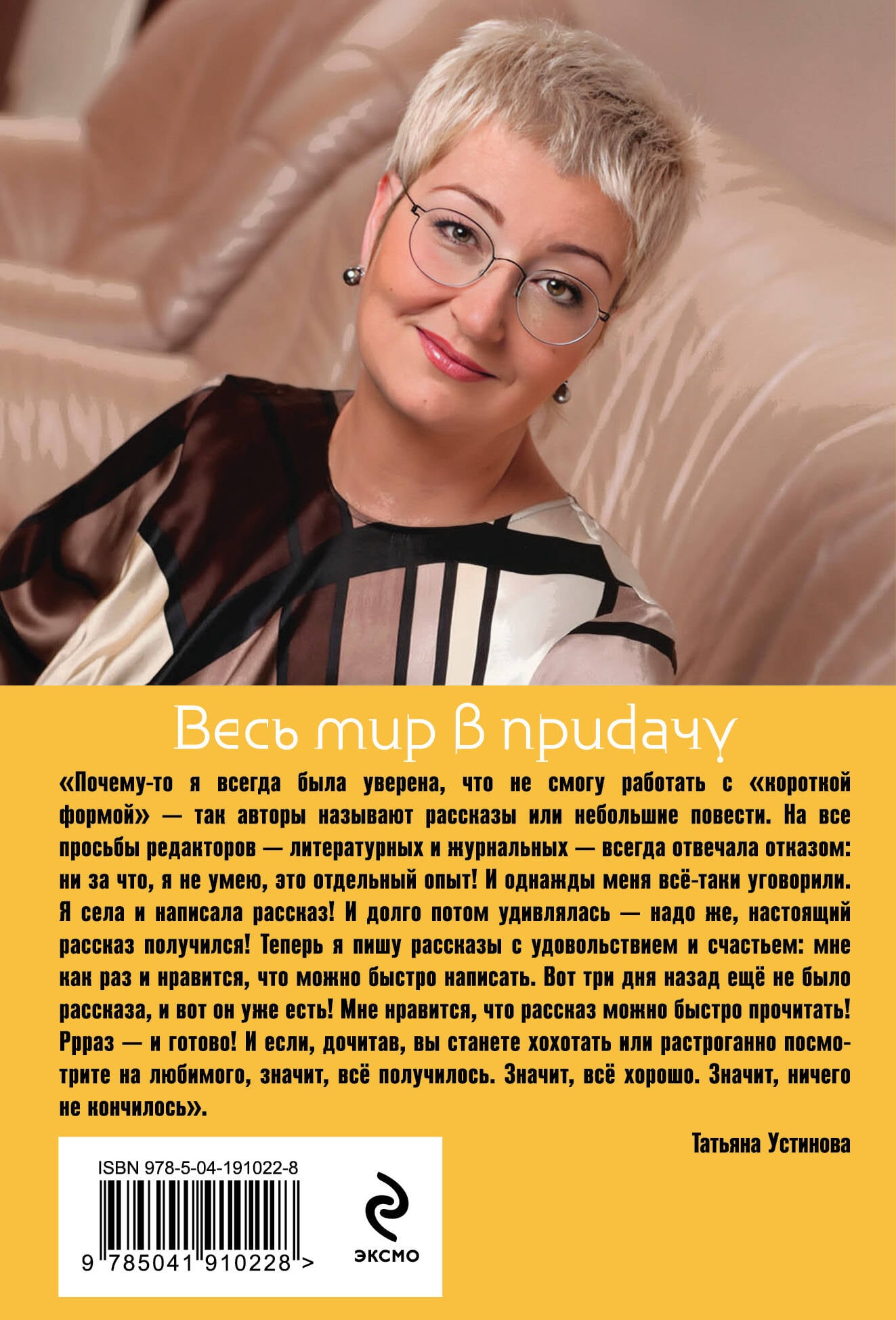 В сборник малой прозы Татьяны Устиновой «Весь мир в придачу» вошли рассказы автора, написанные в разные годы. Короткие остросюжетные истории обладают неизъяснимым очарованием, ведь захватывающий сюжет разворачивается буквально на нескольких страницах, а в финале читателей ждет блистательная развязка. И, конечно, каждая история буквально пропитана всепобеждающей силой любви. В сборник вошли следующие произведения: «Волшебный свет», «И весь мир в придачу», «Вселенский заговор», «У меня зазвонил телефон», «Вот так история».