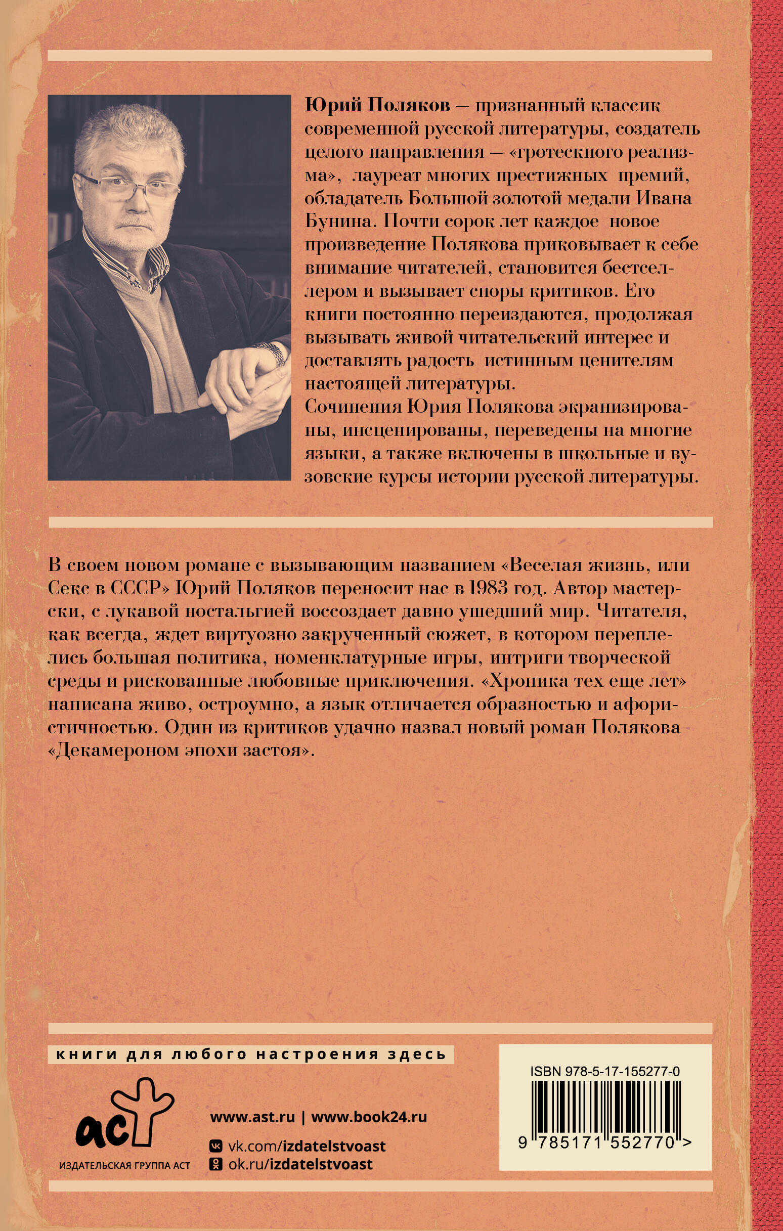 В своем новом романе с вызывающим названием "Веселая жизнь, или секс в СССР" Юрий Поляков переносит нас в 1983 год. Автор мастерски, с лукавой ностальгией воссоздает давно ушедший мир. Читателя, как всегда, ждет виртуозно закрученный сюжет, в котором переплелись большая политика, номенклатурные игры, интриги творческой среды и рискованные любовные приключения. "Хроника тех еще лет" написана живо, остроумно, а язык отличается образностью и афористичностью. Один из критиков удачно назвал новый роман Полякова "Декамероном эпохи застоя". В издание вошли две ранее не опубликованные главы.| Издательство | Издательство "АСТ" |