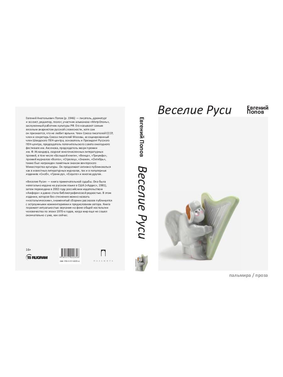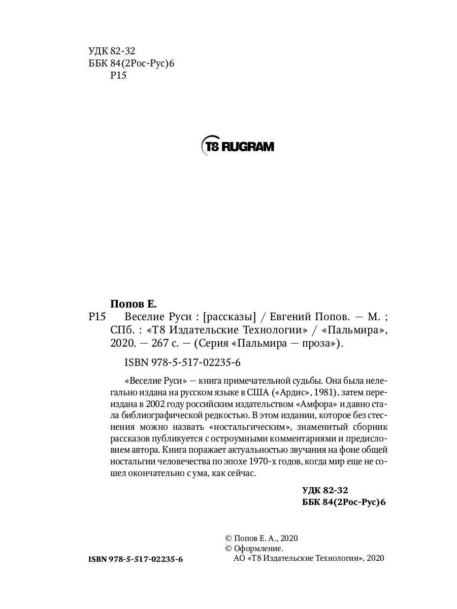 «Веселие Руси» - книга примечательной судьбы. Она была нелегально издана на русском языке в США («Ардис», 1981), затем переиздана в 2002 году российским издательством «Амфора» и давно стала библиографической редкостью. В этом издании, которое без стеснения можно назвать «ностальгическим», знаменитый сборник рассказов публикуется с остроумными комментариями и предисловием автора. Книга поражает актуальностью звучания на фоне общей ностальгии человечества по эпохе 1970-х годов, когда мир еще не сошел окончательно с ума, как сейчас.| Издательство | Т8 RUGRAM |