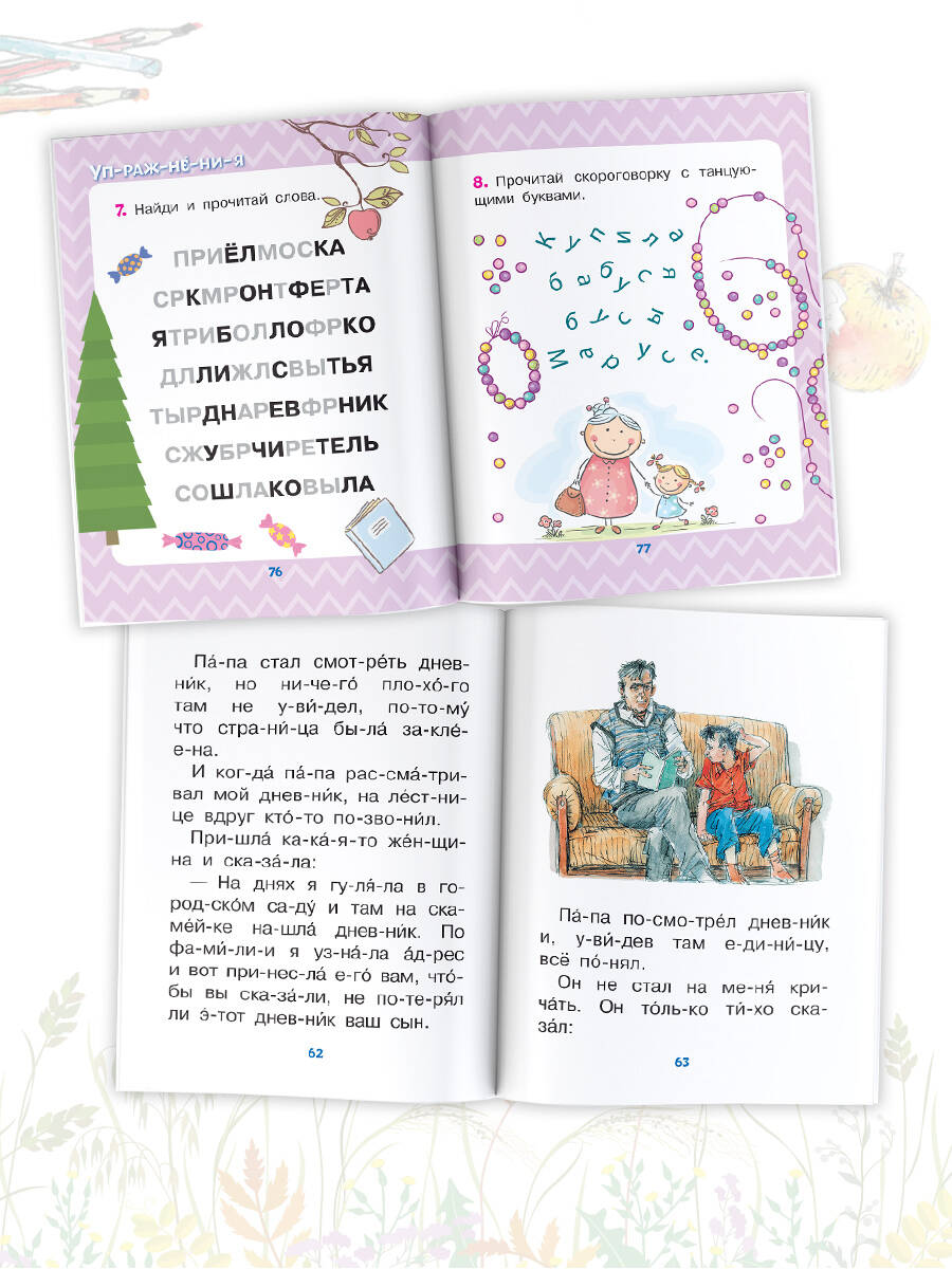 5 причин купить книгу: 1. Простой текст, где все слова с ударениями и разбиты на слоги. 2. Рассказы входят в золотой фонд классики отечественной литературы, развивают чувство родного языка. 3. Истории учат малышей честности, доброте и справедливости 4. Комплекс упражнений для улучшения техники чтения. 5. Физкультминутки с пальчиковой гимнастикой для активизации работы мозга.| Издательство | АСТ |