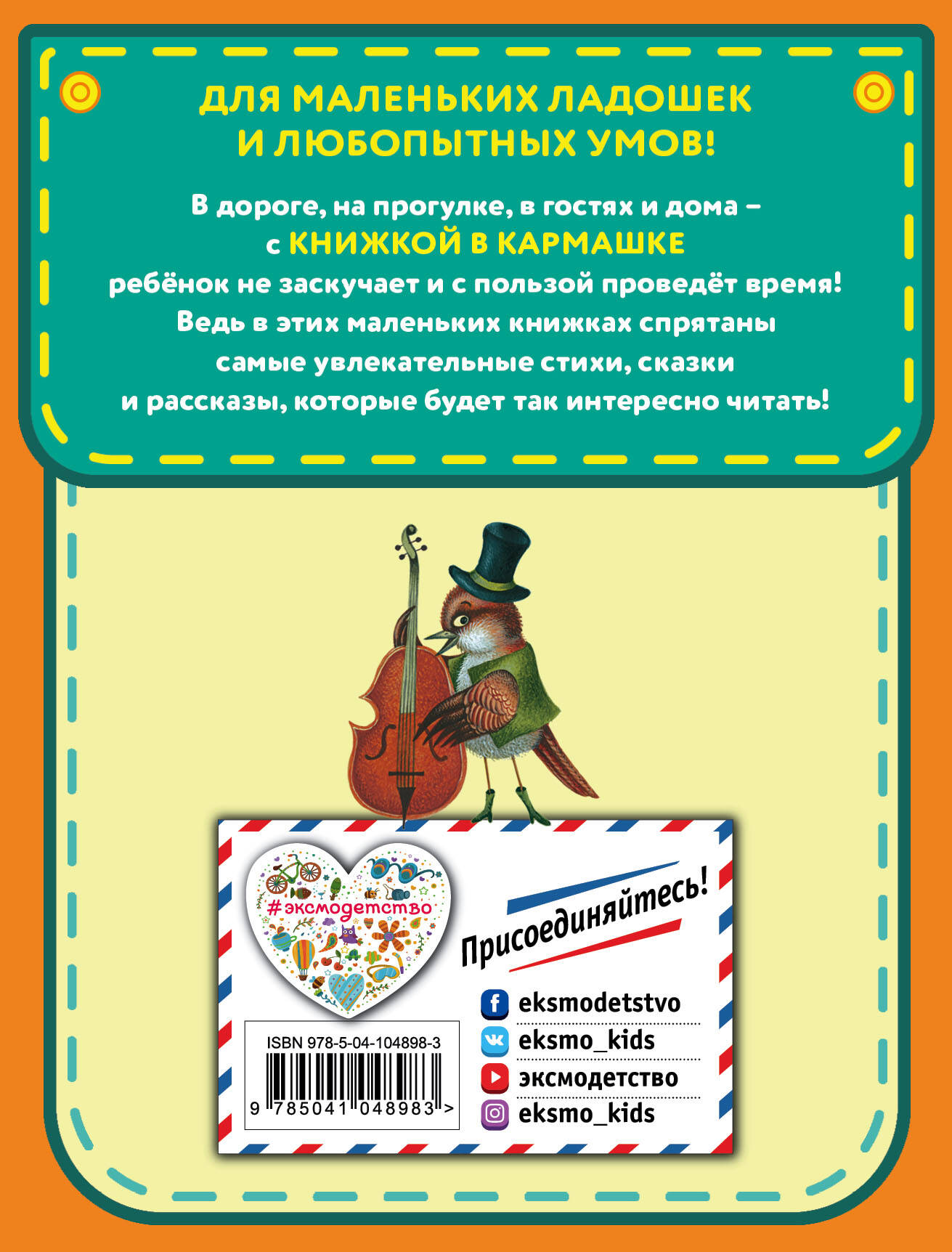 Для маленьких ладошек и любопытных умов! В дороге, на прогулке, в гостях и дома - с КНИЖКОЙ В КАРМАШКЕ ребёнок не заскучает и с пользой проведёт время! Ведь в этих маленьких книжках спрятаны самые увлекательные стихи, сказки и рассказы, которые будет так интересно читать! В этот сборник вошли весёлые, добрые и занимательные стихотворения для детей двух талантливых советских авторов - Ирины Токмаковой и Эммы Мошковской.| Издательство | ООО "Издательство "Эксмо" |