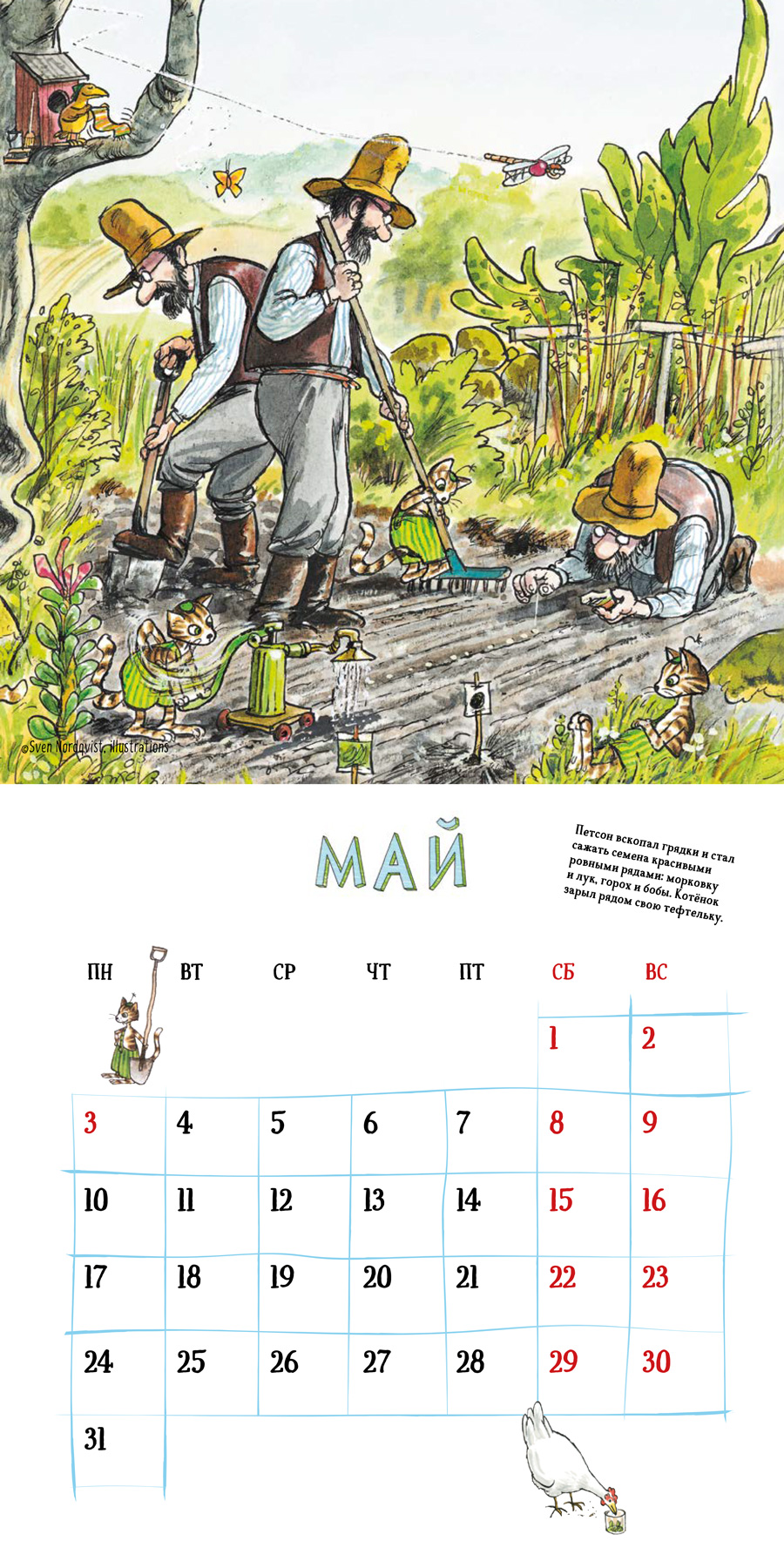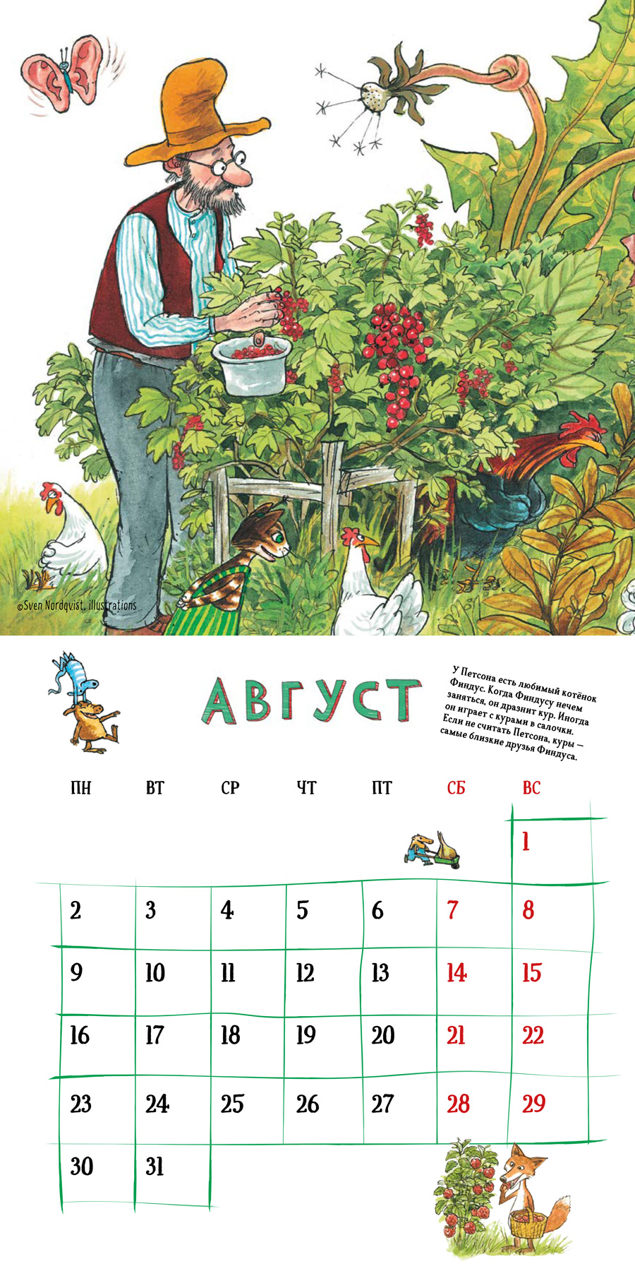 Календарь «Веселый год с Петсоном и Финдусом» на 2021 год с любимыми героями Свена Нурдквиста. Каждый месяц начинается с картинки и цитаты из книг о Петсоне и Финдусе. Календарь вешается на гвоздик.