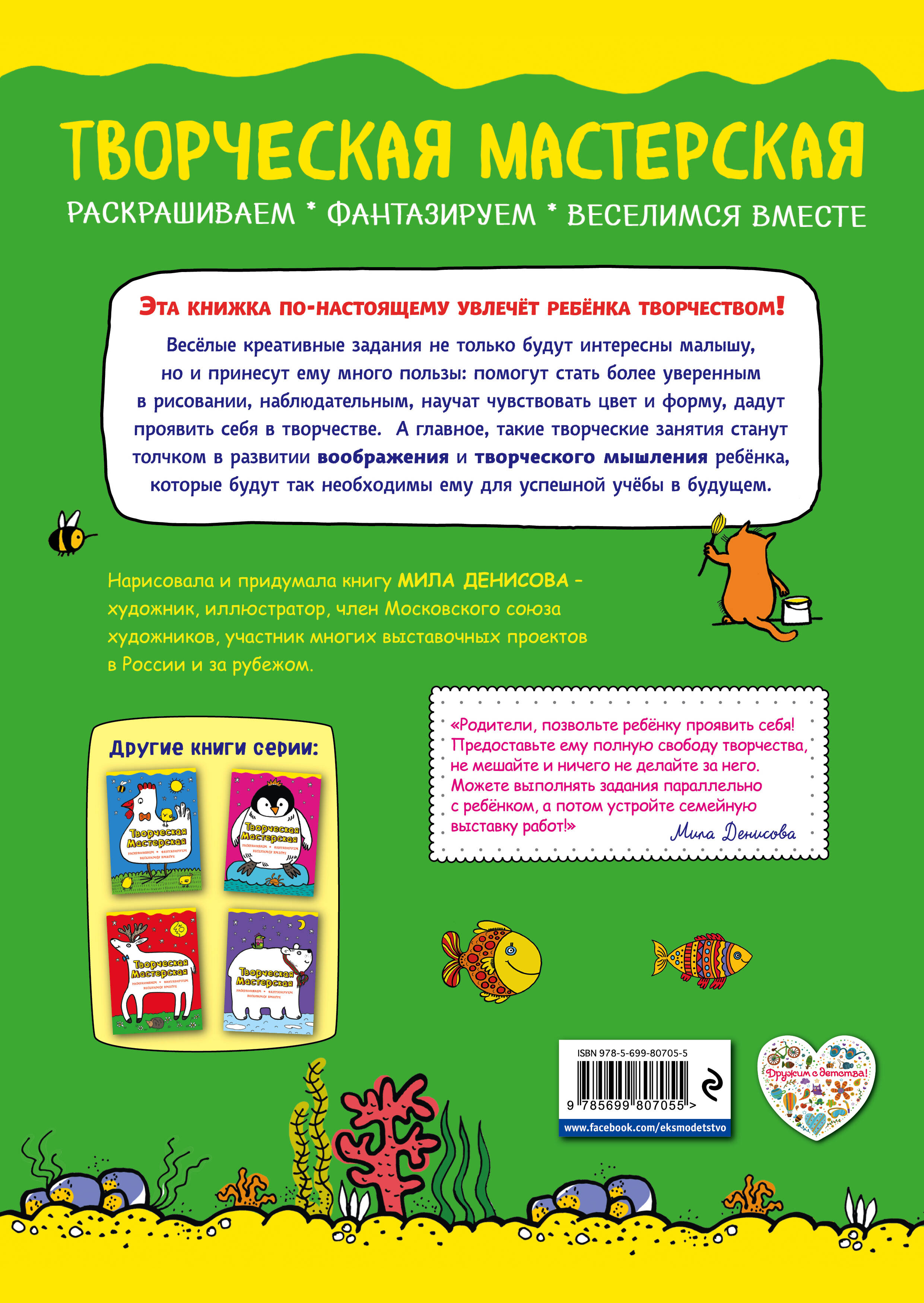 Эта книжка по-настоящему увлечет ребёнка творчеством! Весёлые креативные задания не только будут интересны малышу, но и принесут ему много пользы: помогут стать более уверенным в рисовании, наблюдательным, научат чувствовать цвет и форму, дадут проявить себя в творчестве. А главное, такие творческие занятия станут толчком в развитии воображения и творческого мышления ребенка, которые будут так необходимы ему для успешной учебы в будущем. Нарисовала и придумала книгу Мила Денисова - художник, иллюстратор, член Московского союза художников, участник многих выставочных проектов в России и за рубежом.| Издательство | ООО "Издательство "Эксмо" |