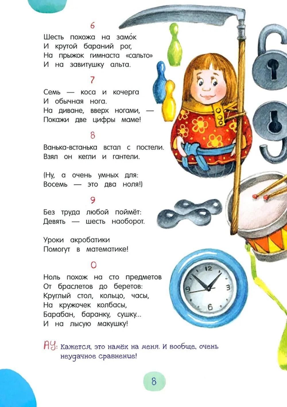 Все, что нужно знать про цифры, числа и счет, - в стихах для детей и с комментариями настоящего профессора, члена Академии математически-поэтического счета! Запоминающиеся рифмы помогут ребенку выучить все цифры, начать складывать, умножать и делить (причем всегда по справедливости). А на красочных иллюстрациях Игоря Зуева и Ирины Якимовой захочется опять и опять пересчитывать ножки у сороконожки, звезды на небе и дырки от вилки в пироге. «Читаю сам!», «Учимся считать!» и «Учим цифры!» - такими могут быть подзаголовки этой детской познавательной книжки: текст идеально подходит для знакомства с буквами и цифрами. «Веселый считарь» отличный подарок для дошкольника (как для девочки, так и для мальчика), и особенно будет приятно получить такую книжку выпускнику детского сада! Книга для детей 3-7 лет.| Издательство | Изд. Лабиринт Пресс |
