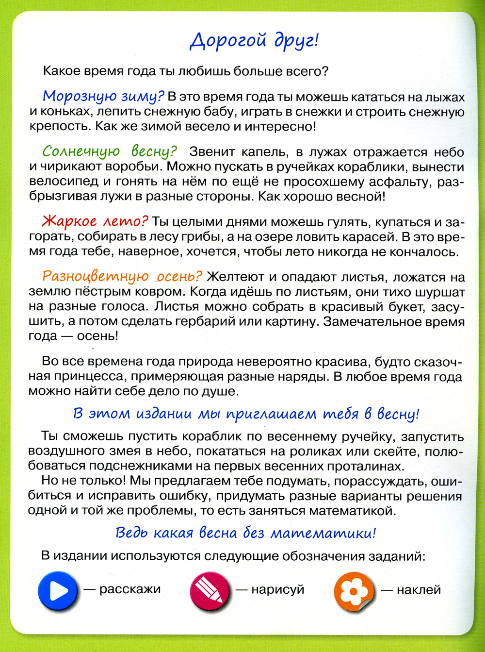 Замечательное время года - осень! Во все времена года природа невероятно красива, будто сказочная принцесса, примеряющая разные наряды. В любое время года можно найти себе дело по душе. В этом издании мы приглашаем тебя в весну! Ты сможешь пустить кораблик по весеннему ручейку, запустить воздушного змея в небо, покататься на роликах или скейте, полюбоваться подснежниками на первых весенних проталинах. Но не только! Мы предлагаем тебе подумать, порассуждать, ошибиться и исправить ошибку, придумать разные варианты решения одной и той же проблемы, то есть заняться математикой. Ведь какая весна без математики!
