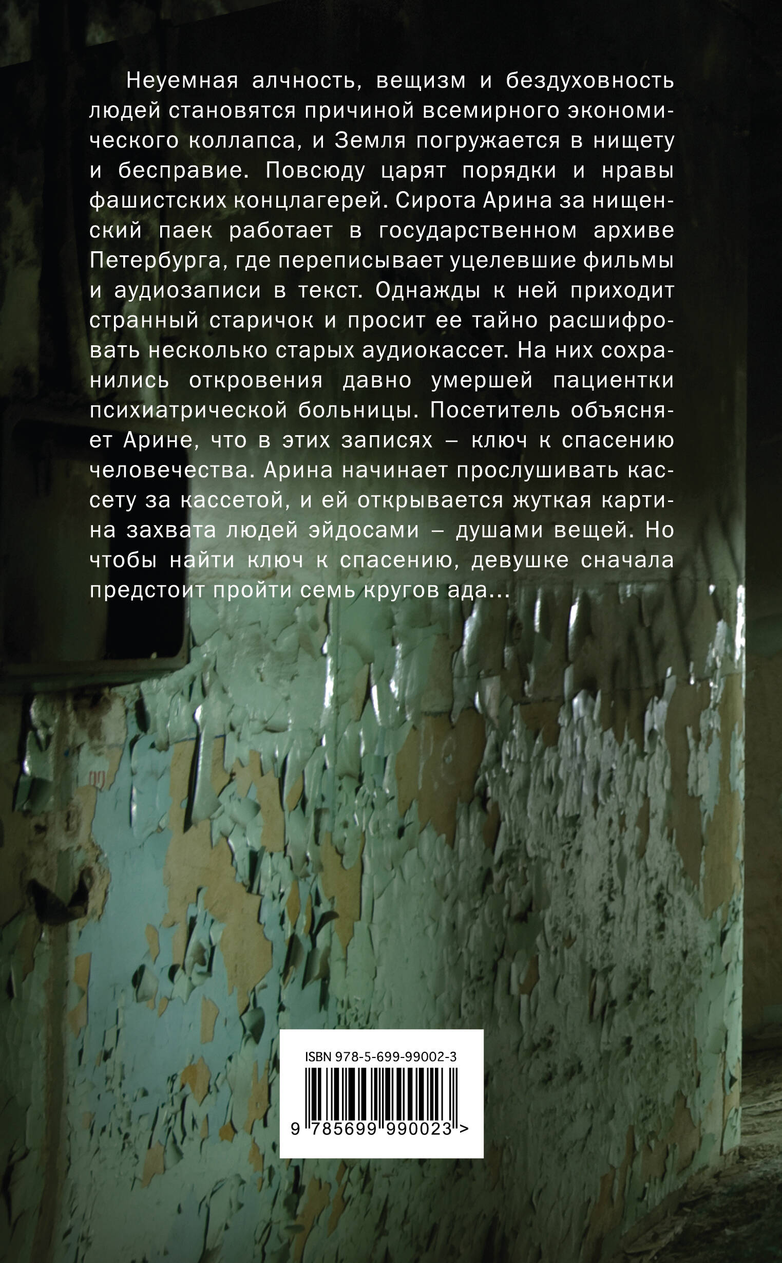 Неуемная алчность, вещизм и бездуховность людей становятся причиной всемирного экономического коллапса, и Земля погружается в нищету и бесправие. Повсюду царят порядки и нравы фашистских концлагерей. Сирота Арина за нищенский паек работает в государственном архиве Петербурга, где переписывает уцелевшие фильмы и аудиозаписи в текст. Однажды к ней приходит странный старичок и просит ее тайно расшифровать несколько старых аудиокассет. На них сохранились откровения давно умершей пациентки психиатрической больницы. Посетитель объясняет Арине, что в этих записях - ключ к спасению человечества. Арина начинает прослушивать кассету за кассетой, и ей открывается жуткая картина захвата людей эйдосами - душами вещей. Но чтобы найти ключ к спасению, девушке сначала предстоит пройти семь кругов ада...| Издательство | ООО "Издательство "Эксмо" |