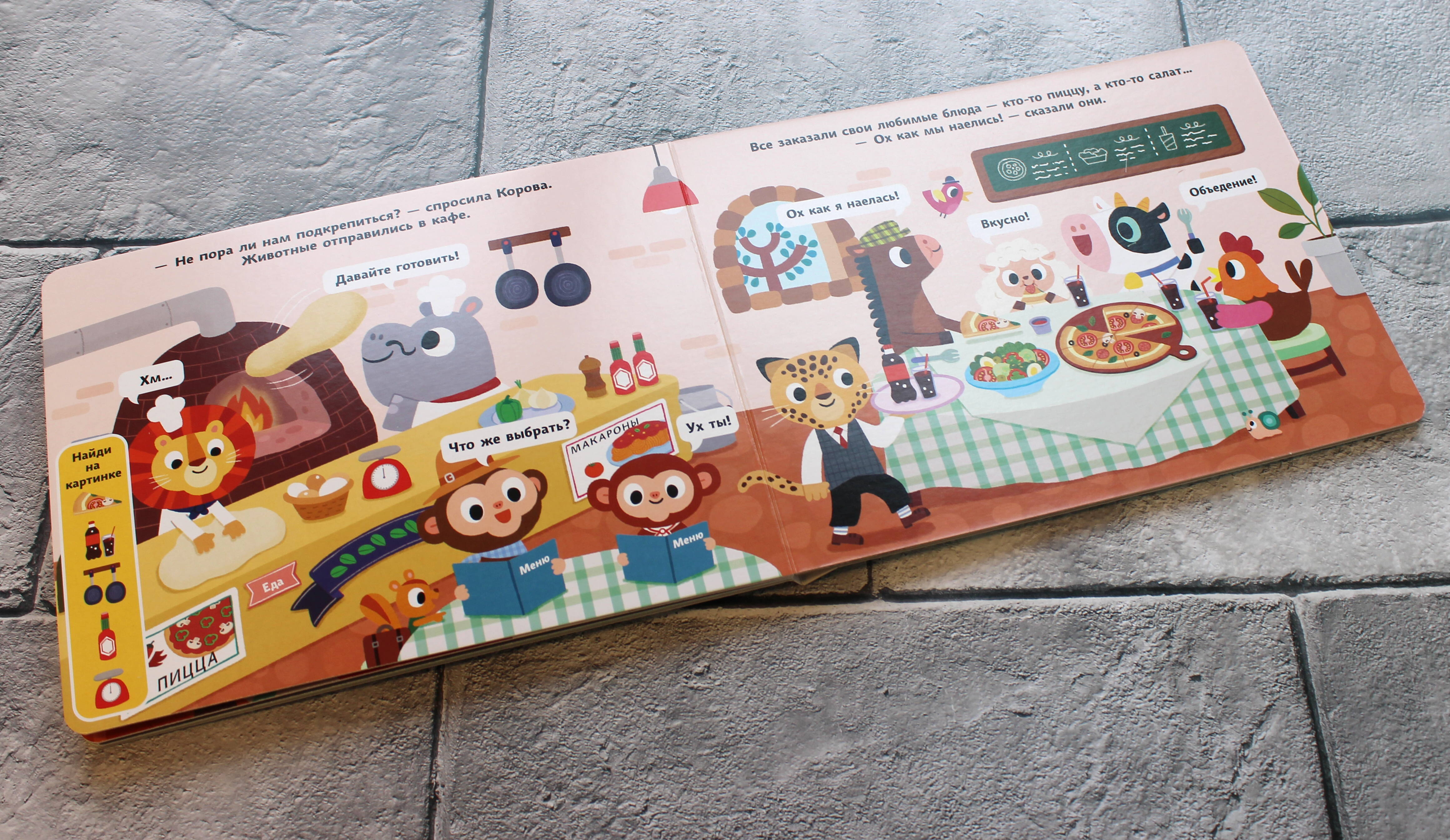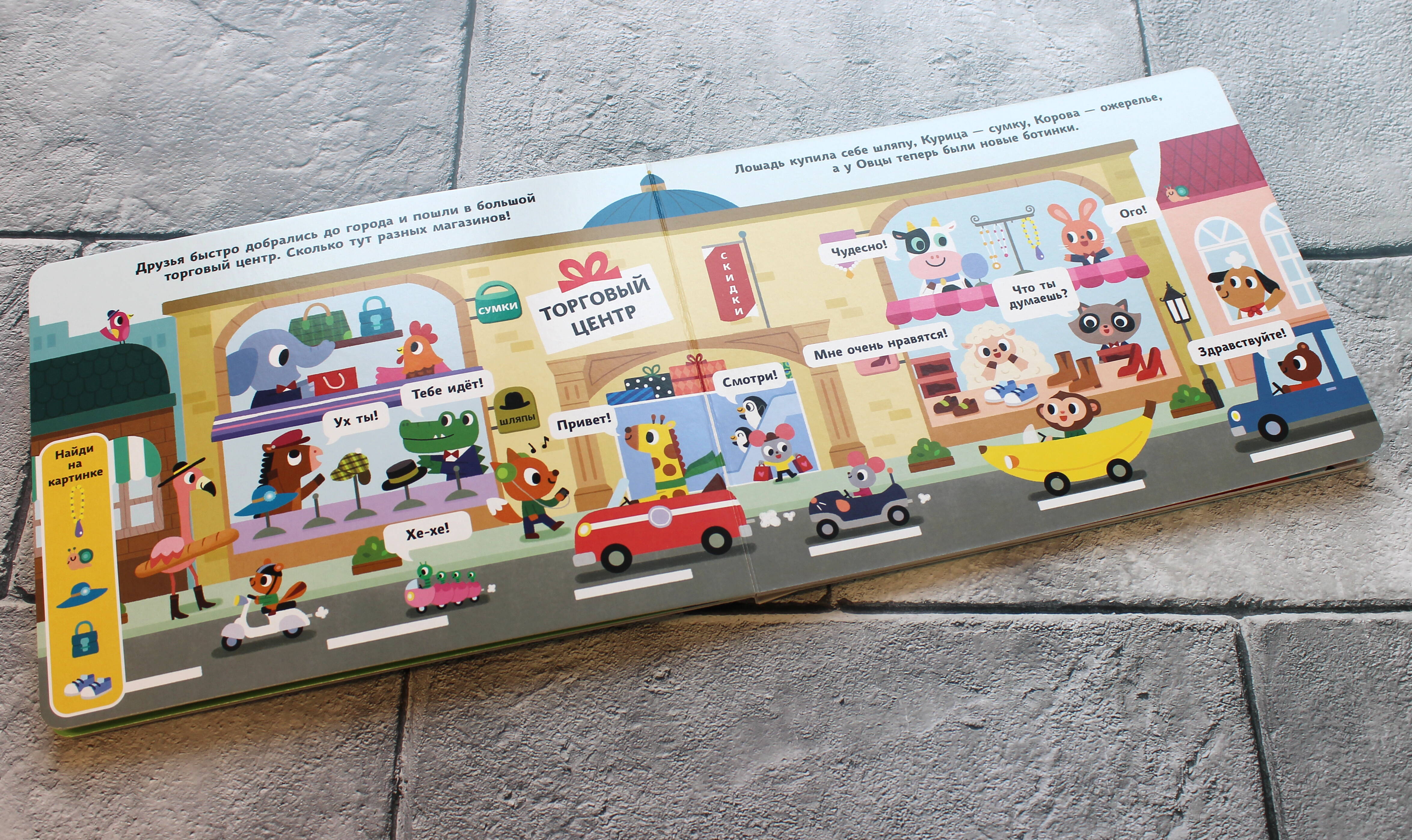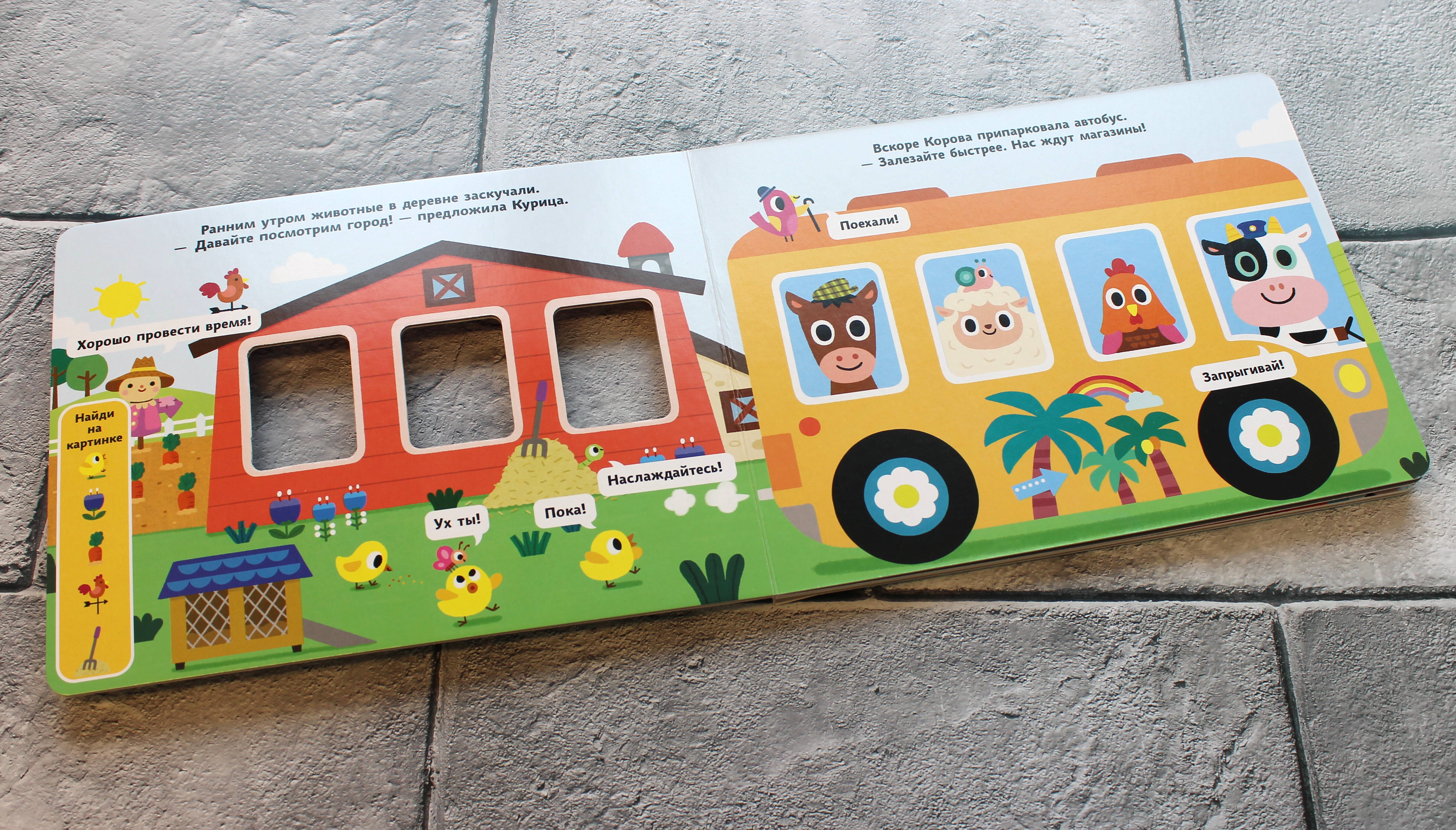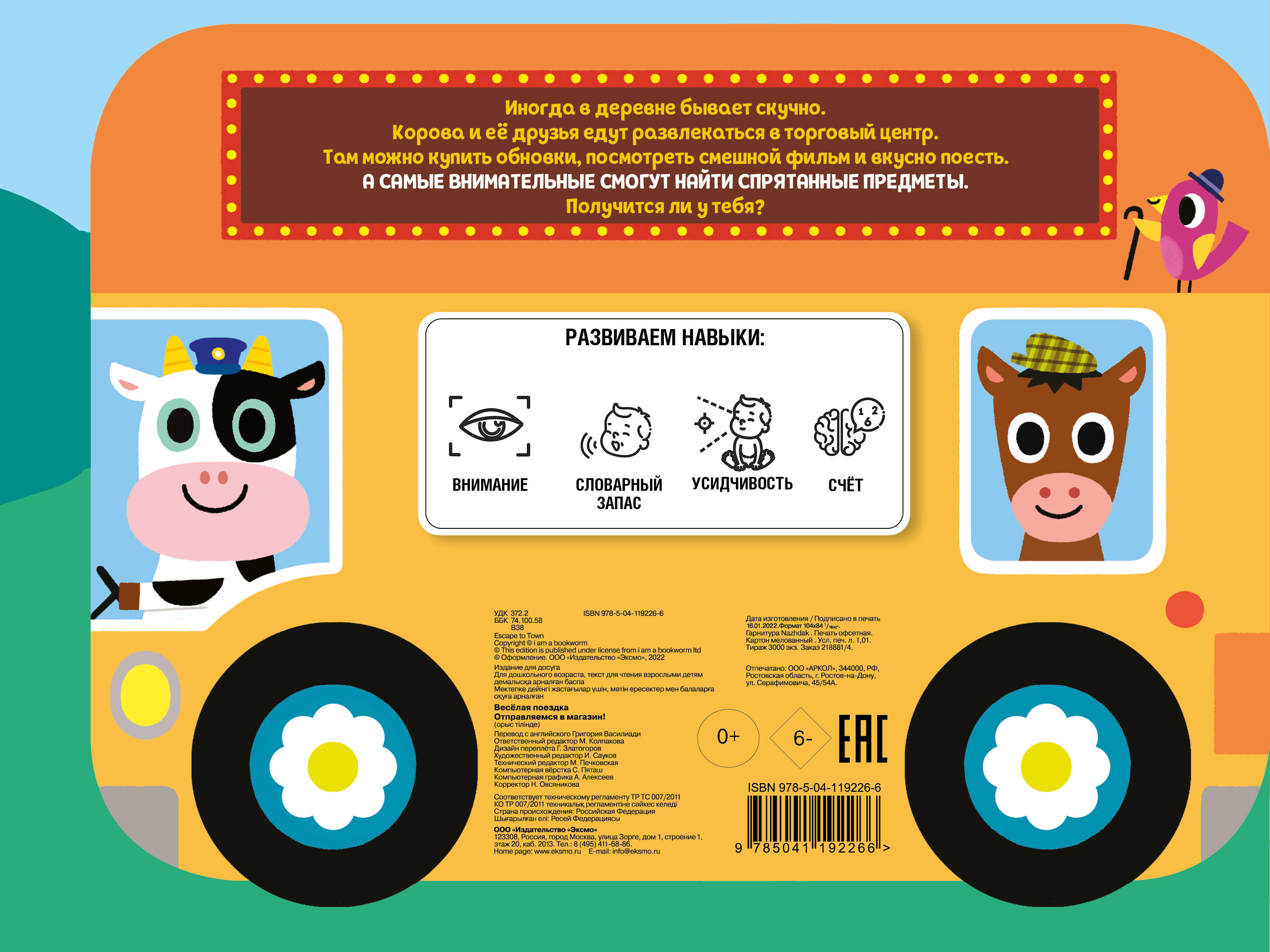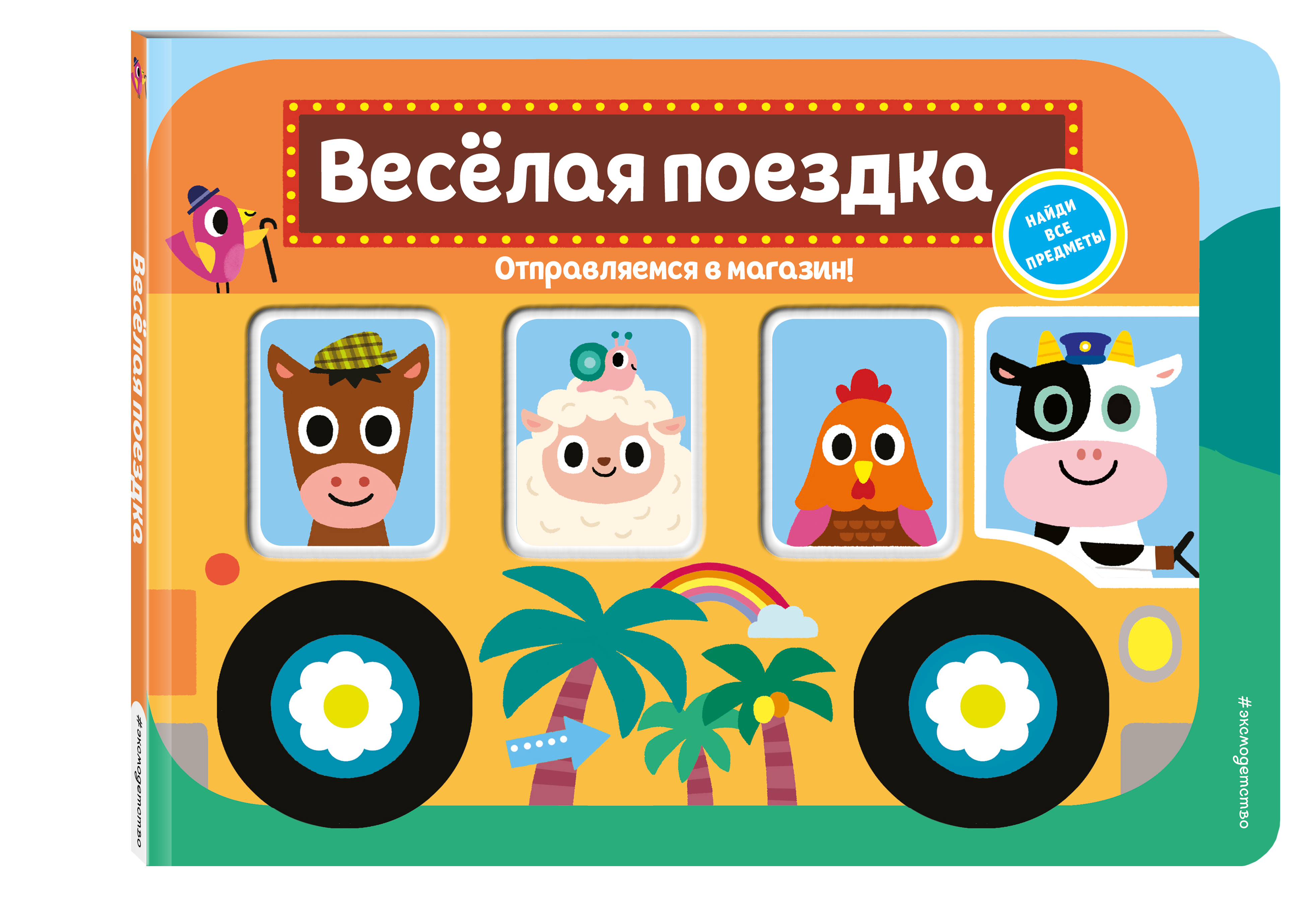 Чем заняться животным в деревне, если стало скучно? Конечно же, отправиться в весёлую поездку на автобусе в город! Вместе с животными мы посетим огромный торговый центр, побываем в кинотеатре и зайдём в кафе, чтобы отведать вкусной еды. КНИЖКИ-НАХОДИЛКИ На каждом развороте вас ждут спрятанные на картинке предметы. Читайте историю, ищите предметы и находите их вместе с ребёнком. КНИЖКИ-ОБУЧАЛКИ А ещё можно рассматривать иллюстрации и считать предметы, сравнивать их по цвету и размеру, описывать, что делает каждый из героев. КНИЖКИ-КУСАЛКИ Книжки изготовлены из плотного целлюлозного картона, покрытого специальным защитным слоем, поэтому полностью безопасны для здоровья малыша. Кроме того, они имеют скруглённые уголки, которые не позволят маленьким деткам пораниться. КНИЖКИ-РАЗВИВАЙКИ Серия книжек-картонок «Весёлые окошки» поможет развить внимание, наблюдательность и усидчивость, а также увеличить активный и пассивный словарный запас вашего малыша.| Издательство | Эксмо |