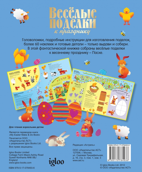 Головоломки, подробные инструкции для изготовления поделок, более 60 наклеек и готовые детали - только выдави и собери. В этой фантастической книжке собраны веселые поделки к весеннему празднику - Пасхе. Ребенку обязательно понравится эта книга, с помощью которой он сможет самостоятельно сделать подарки для друзей и близких.