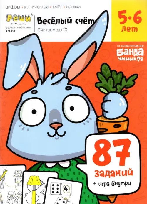 Тетрадь, с которой ребёнок полюбит считать! Закрепляем образы цифр Учимся соотносить число с количеством Закрепляем знание числового ряда В тетради "Весёлый счёт" собрано 87 заданий, которые учат счёту в пределах 10 и бонусная игра, в которую можно играть много раз. Каждое задание - это увлекательная история в картинках, доступная для понимания ребёнком даже без участия взрослых. В тетрадях "Весёлый счёт" нет скучных примеров. Задания в этих пособиях спроектированы так, чтобы дети с удовольствием брались за их решение и подолгу не могли оторваться от процесса. При этом увлекательные сюжеты заданий и интуитивно понятные инструкции позволяют заниматься без помощи взрослых. Счёт до 10 - это одна из первых ступеней на пути подготовки к школе. С него начинается знакомство с миром математики. В тетради "Весёлый счёт" для 5-6 лет малыши знакомятся с базовыми математическими понятиями с помощью наглядных примеров из реальной жизни. Например, образы цифр легче запомнить, когда ищешь нужные свечи для именинного торта, а числовой ряд проще понять, если искать своё место в кинотеатре.