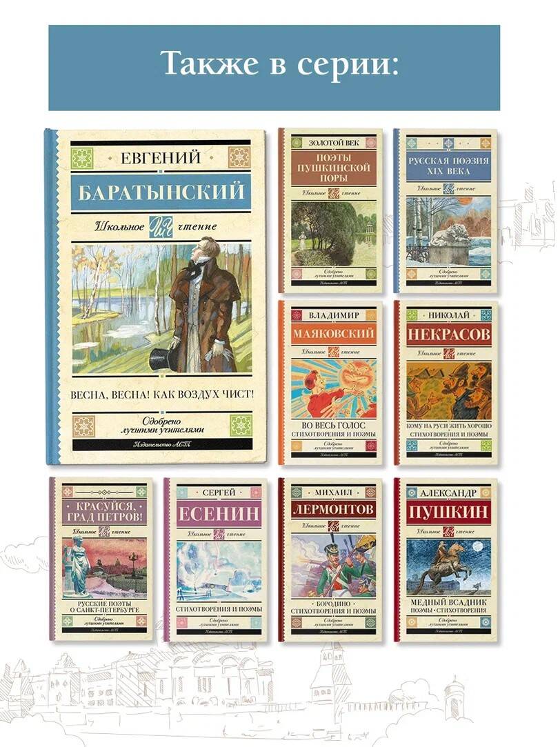 Евгений Абрамович Баратынский (1800-1844) - поэт золотого века русской литературы и видный переводчик. Во время военной службы в лейбгвардии Егерьевского полка Баратынский заводит близкую дружбу с А. Пушкиным и А. Дельвигом, а позже знакомится с другими литераторами пушкинского круга: Н. Гнедичем, П. Вяземским и В. Кюхельбекером. Пётр Вяземский скажет о товарищах: "Пушкин, Дельвиг, Баратынский - русской музы близнецы". Особое место в творчестве поэта занимает лирика о природе. В сборник вошли лучшие стихотворения и поэмы Е.А. Баратынского, которые изучают в школе: "Весна, весна! как воздух чист!..", "Осень", "Где сладкий шепот..." и другие.| Издательство | ИЗДАТЕЛЬСТВО "АСТ" |