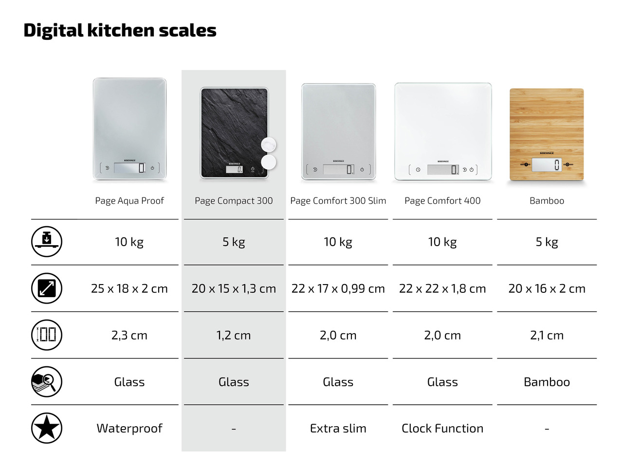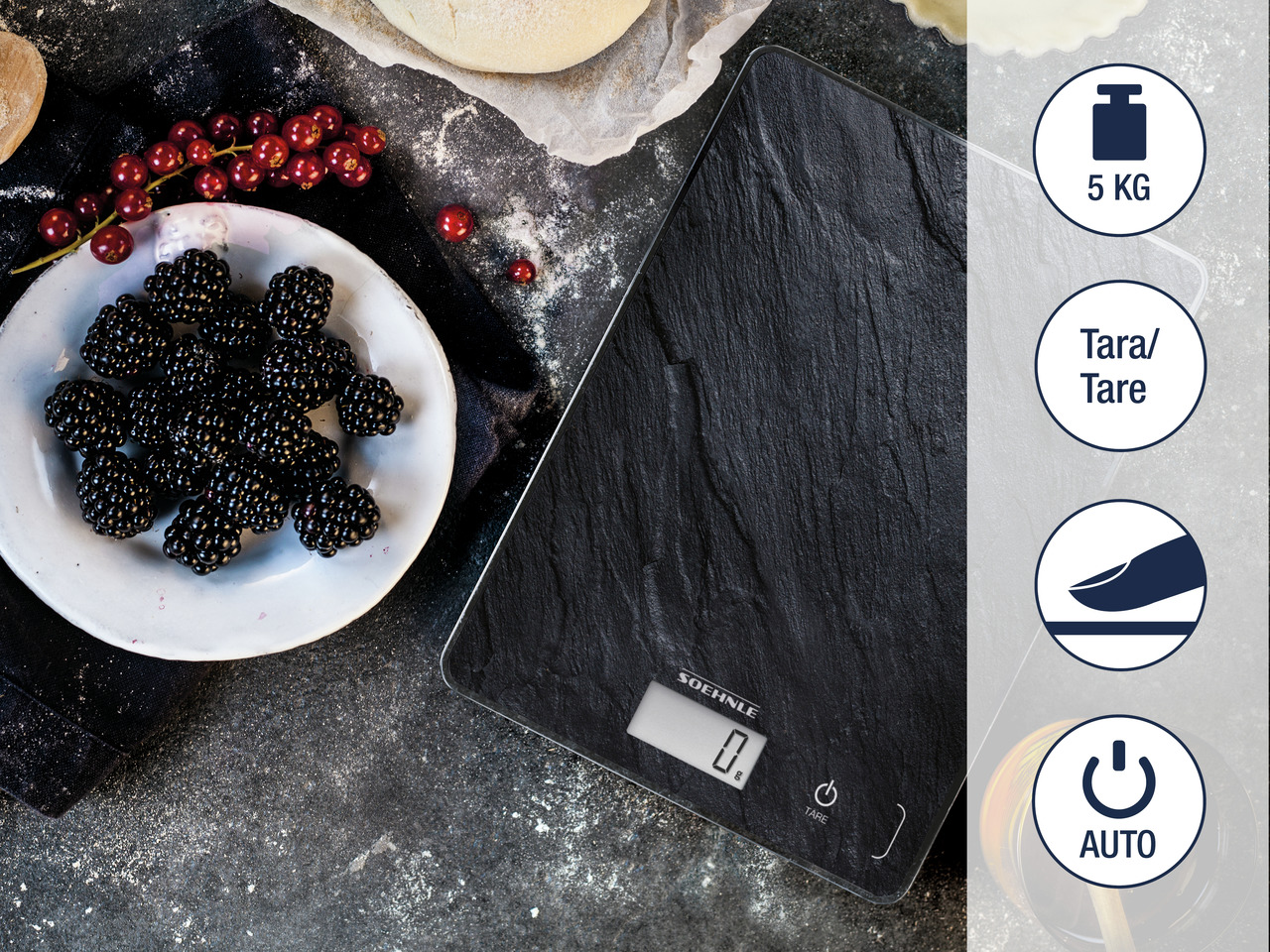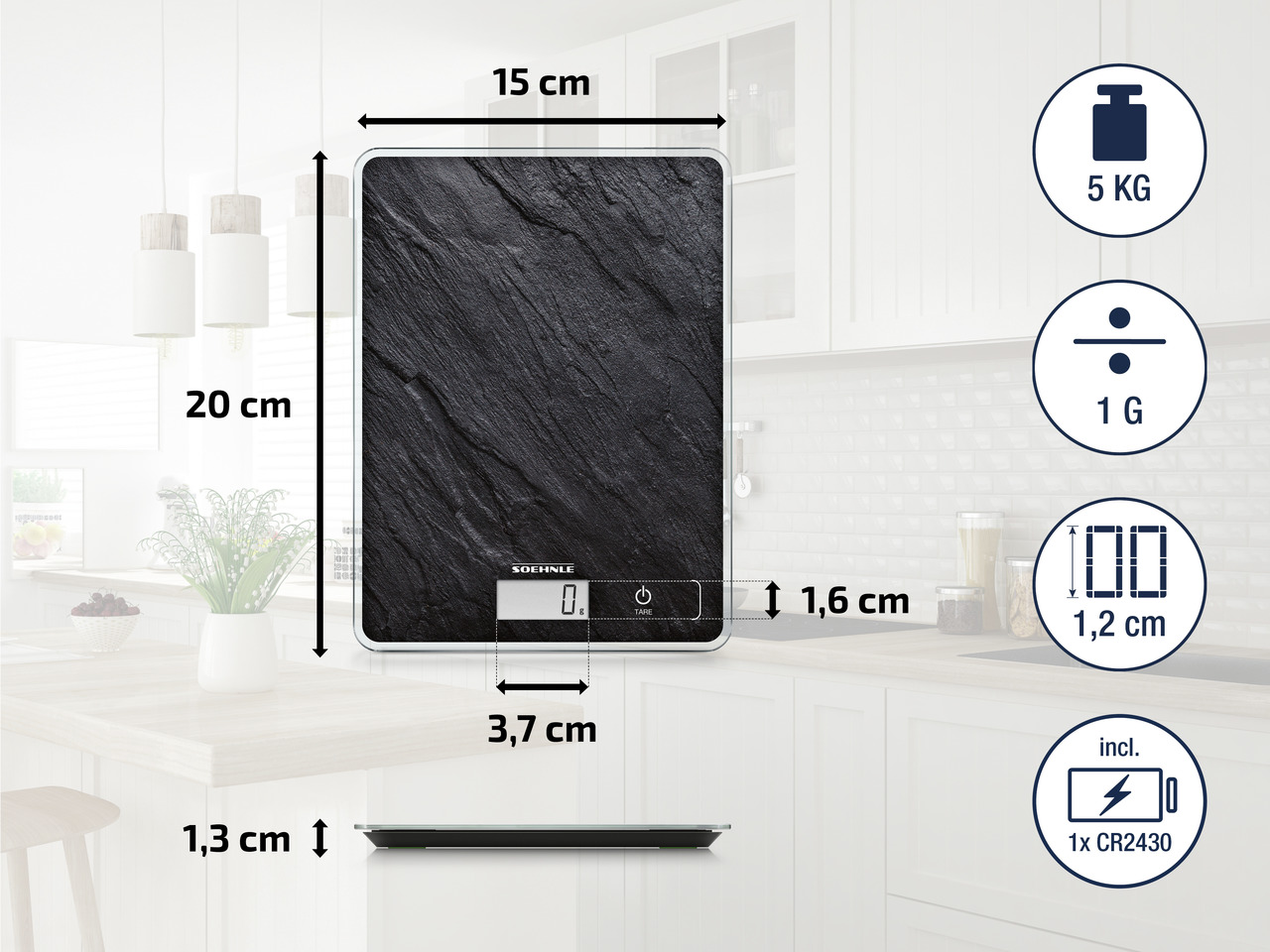 Дизайн сланца и элегантная плоская поверхность весов делают эти весы украшением кухни, которое можно даже повесить на стену в качестве элемента дизайна.