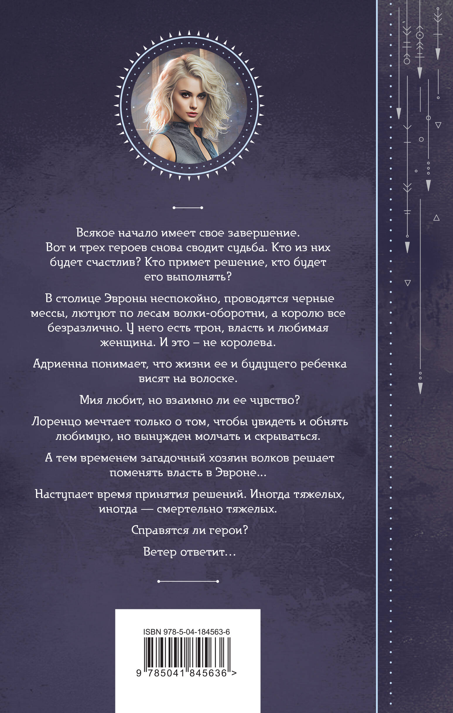 Всякое начало имеет свое завершение. Вот и трех героев снова сводит судьба. Кто из них будет счастлив? Кто примет решение, кто будет его выполнять? . В столице Эвроны неспокойно, проводятся черные мессы, лютуют по лесам волки-оборотни, а королю все безразлично. у него есть трон, власть и любимая женщина. И это - не королева. Адриенна понимает, что жизни ее и будущего ребенка висят на волоске. Мия любит, но взаимно ли ее чувство? Лоренцо мечтает только о том, чтобы увидеть и обнять любимую, но вынужден молчать и скрываться. А тем временем загадочный хозяин волков решает поменять власть в Эвроне... . Наступает время принятия решений. Иногда тяжелых, иногда - смертельно тяжелых. Справятся ли герои? Ветер ответит… Вам нужна эта книга, если вы хотите узнать: 1. Чем закончилась история Мии и Адриенны? 2. Почему меняют цвет розы в дворцовом парке, какова судьба клинка Эрвлинов и существует ли справедливость? 3. В чем заключалась тайна дворцового переворота и как уходят в легенду потомки Древней Крови? 4. Можно ли вернуться живым с эшафота? А сразиться с оборотнями - и выйти победителем? 5. Как взлететь над Эвроной на вороньих крыльях? 6. Все ли герои нашли свое счастье - или получили по заслугам?| Издательство | ООО "Издательство "Эксмо" |