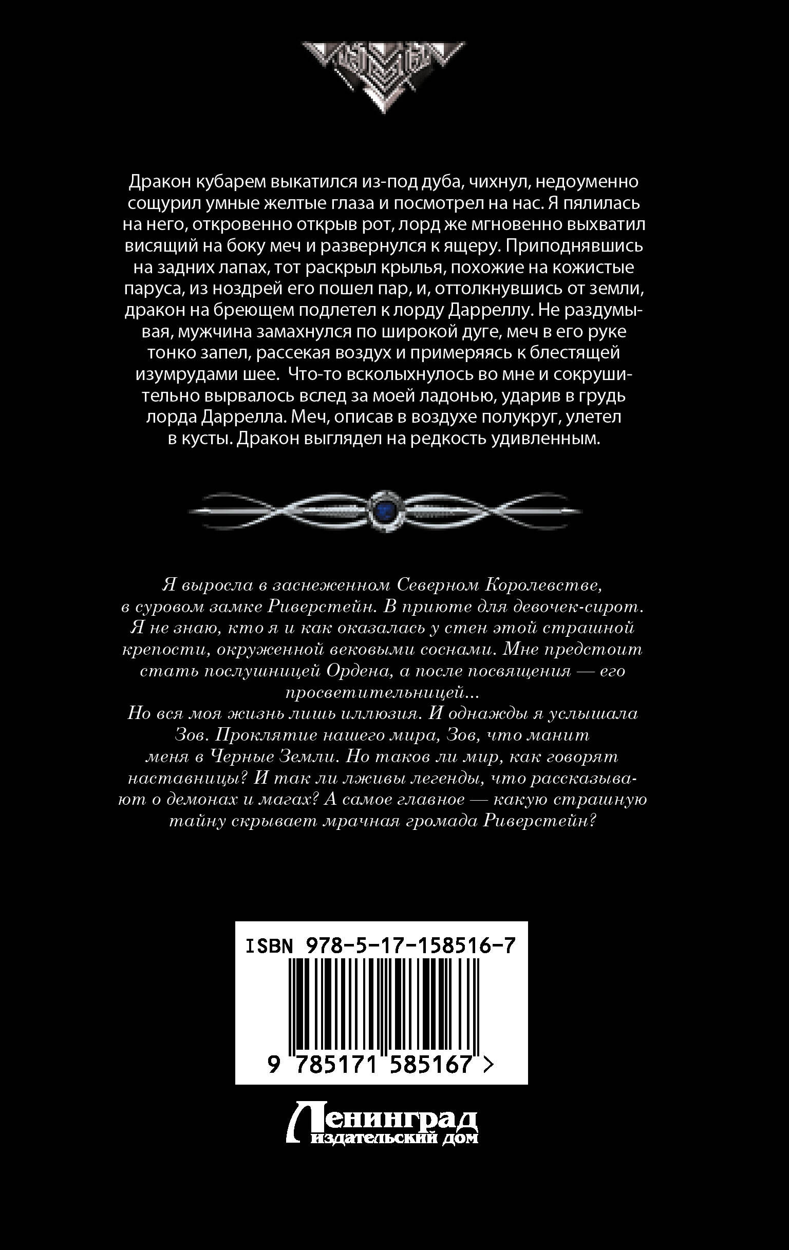 Я выросла в заснеженном Северном Королевстве, в суровом замке Риверстейн. В приюте для девочек-сирот. Я не знаю, кто я и как оказалась у стен этой страшной крепости, окруженной вековыми соснами. Мне предстоит стать послушницей Ордена, а после посвящения - его просветительницей... Но вся моя жизнь лишь иллюзия. И однажды я услышала Зов. Проклятие нашего мира, Зов, что манит меня в Черные Земли. Но таков ли мир, как говорят наставницы? И так ли лживы легенды, что рассказывают о демонах и магах? А самое главное - какую страшную тайну скрывает мрачная громада Риверстейн?