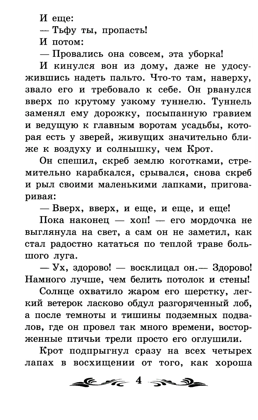 Герои смешной, а иногда грустной сказки, так полюбившейся и маленьким, и взрослым читателям, - звери, наделенные трогательными и подчас смешными человеческими качествами. Множество захватывающих приключений ожидают любознательного Крота, деликатного Рэта, мудрого Барсука и легкомысленного Тоуда в истории, сочиненной когда-то Кеннетом Грэмом для своего маленького сына.