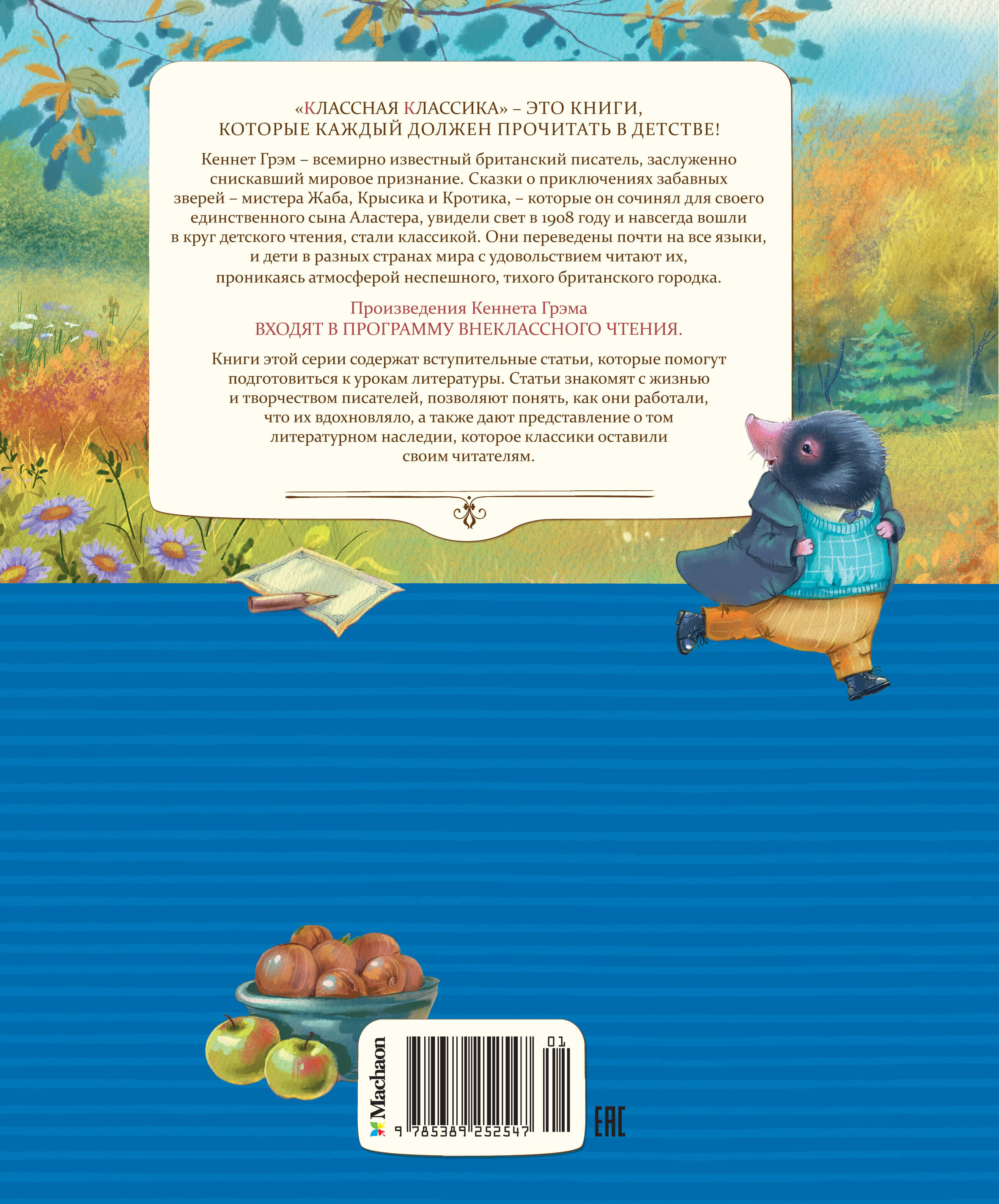 Кеннет Грэм - всемирно известный британский писатель, заслуженно снискавший мировое признание. Сказки, о приключениях забавных зверей: мистера Жаба, Крысика и Кротика, которые он сочинял для своего единственного сына Аластера, увидели свет в 1908 году и навсегда вошли в круг детского чтения, стали классикой. Они переведены почти на все языки, и дети в разных странах мира с удовольствием читают их, проникаясь атмосферой неспешного тихого британского городка.