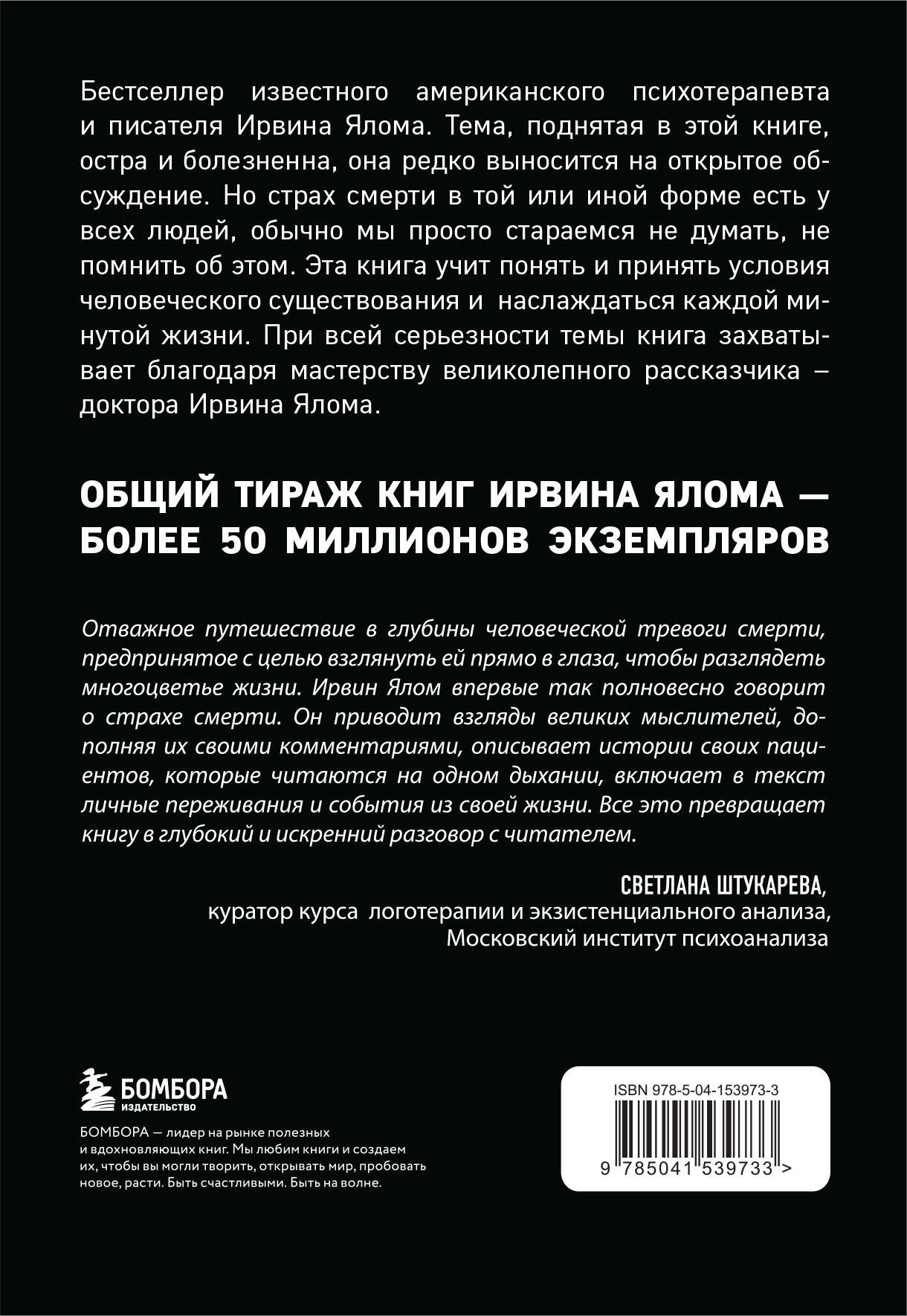 О чем эта книга Эта книга учит понять и принять условия человеческого существования и сполна наслаждаться каждой минутой жизни, избавляясь от мешающих всем нам страхов, включая страх смерти. При всей серьезности темы книга захватывает и увлекает благодаря мастерству великолепного рассказчика - доктора Ирвина Ялома. Кто автор ИРВИН Д. ЯЛОМ - всемирно известный американский писатель и психотерапевт, почетный профессор психиатрии Стэнфордского университета. Его романы «Шопенгауэр как лекарство», «Когда Ницше плакал», «Лжец на кушетке», «Вглядываясь в солнце», «Проблема Спинозы» завоевали сердца миллионов читателей и стали бестселлерами во многих странах. Ирвин Ялом по праву считается первооткрывателем жанра психотерапевтической литературы, объединяющим увлекательные сюжеты с осмыслением главных вопросов в жизни человека и психотерапевтическим эффектом. Для кого эта книга Для поклонников творчества Ирвина Ялома и всех, кто интересуется психологией, психотерапией и хорошей литературой. Фишки книги Бонус от И. Ялома для нового издания - новый рассказ «Я позову полицию!». Вам предоставляется возможность узнать Ялома как мастера малых литературных форм.| Издательство | Эксмо |