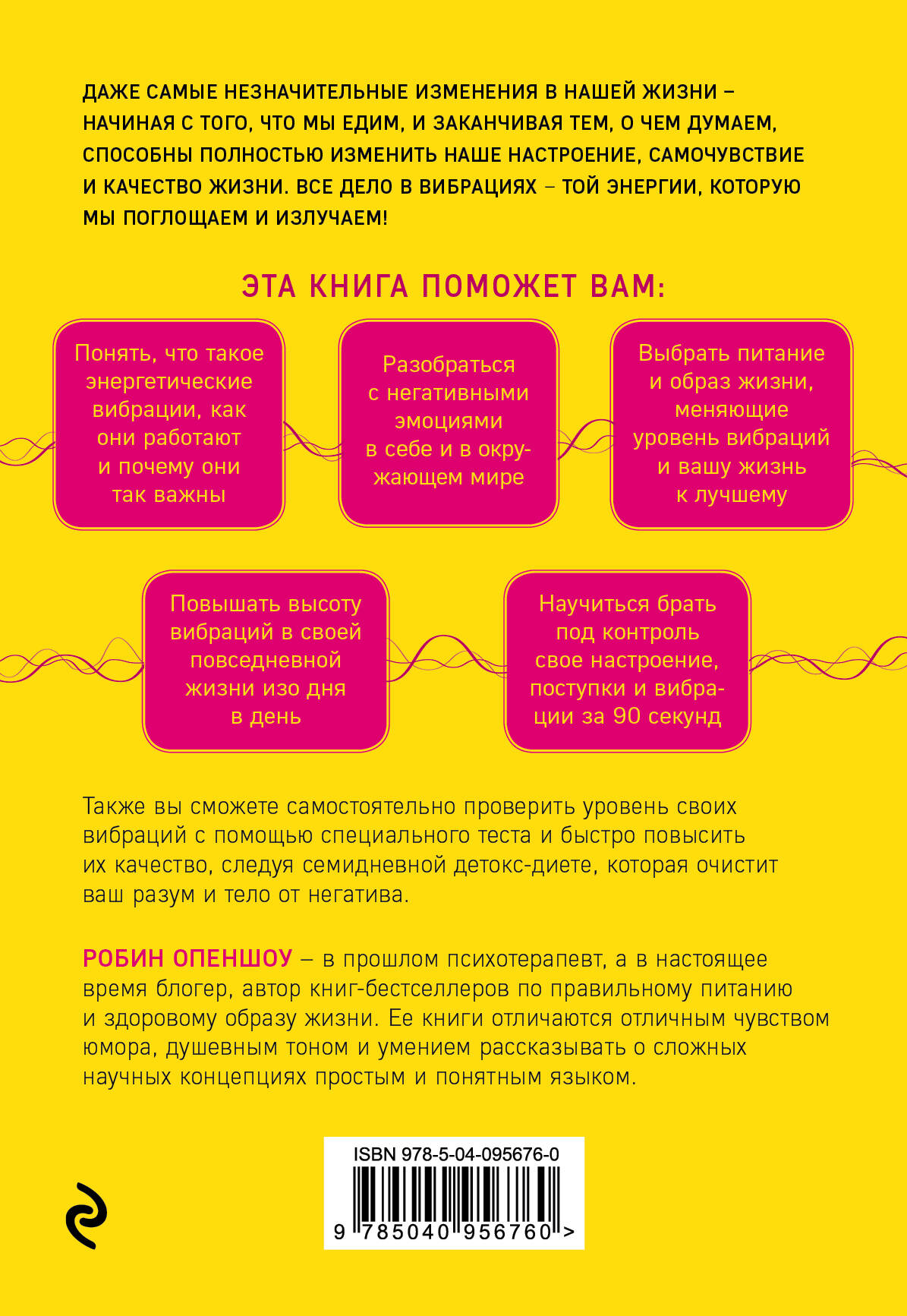 Книга для тех, кто хочет управлять своей энергией - и привлекать в жизнь только счастливые позитивные события, здоровье и любовь Вселенной! Даже самые незначительные изменения в нашей жизни - начиная с того, что мы едим, и заканчивая тем, что думаем, способны полностью изменить наше настроение, самочувствие и качество жизни. Все дело в вибрациях - той энергии, которую мы поглощаем и излучаем! Эта книга поможет вам: • Понять, что такое энергетические вибрации, как они работают и почему они так важны • Повышать высоту вибраций в своей повседневной жизни изо дня в день • Разобраться с негативными эмоциями в себе и в окружающем мире • Научиться брать под контроль свое настроение, поступки и вибрации за 90 секунд • Выбрать питание и образ жизни, меняющие уровень вибраций и вашу жизнь к лучшему Также вы сможете самостоятельно проверить уровень своих вибраций с помощью специального теста и быстро повысить их качество, следуя семидневной детокс-диете, которая очистить ваш разум и тела от негатива. «Все вокруг нас излучает энергию. Даже наша еда, тела, мысли и эмоции. С этой революционной книгой вы научитесь смотреть на окружающий мир совершенно по-новому!» Педрам Шоджай, автор книг «Городской монах» и «Искусство останавливать время» Робин Опеншоу - в прошлом психотерапевт, а в настоящее время блогер, автор книг-бестселлеров по правильному питанию и здоровому образу жизни. Ее книги отличает отличное чувство юмора, душевный тон и умение рассказывать о сложных научных концепциях простым и понятным языком.| Издательство | ООО "Издательство "Эксмо" |